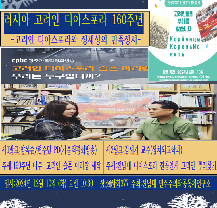 고려인 디아스포라 160주년 평화방송 다큐와 전남대 전공연계 봉사 발표회 2024.12.9.(월) ~ 2024.12.13.(금)(5일간) 사회377 참여대상: 전체(모든사람) 행사방식 : 오프라인(대면) 공유하기