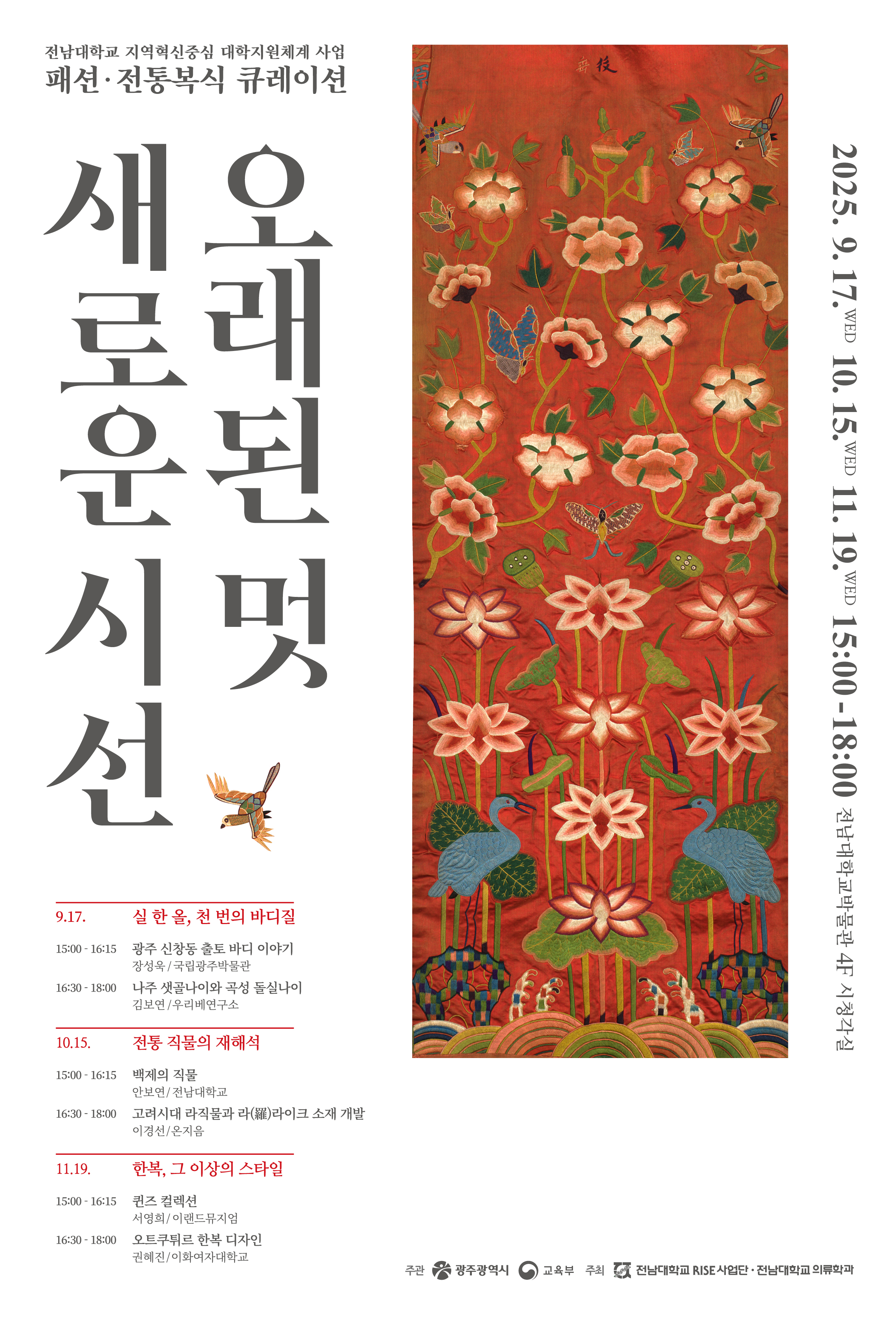 지역과 대학의 동반 성장을 이끄는 전남대학교 RISE 사업단과 의류학과가 공동 주최하는 ‘오래된 멋, 새로운 시선: 패션-전통복식 큐레이션 교육 프로그램’에 많은 관심과 참여 부탁드립니다.