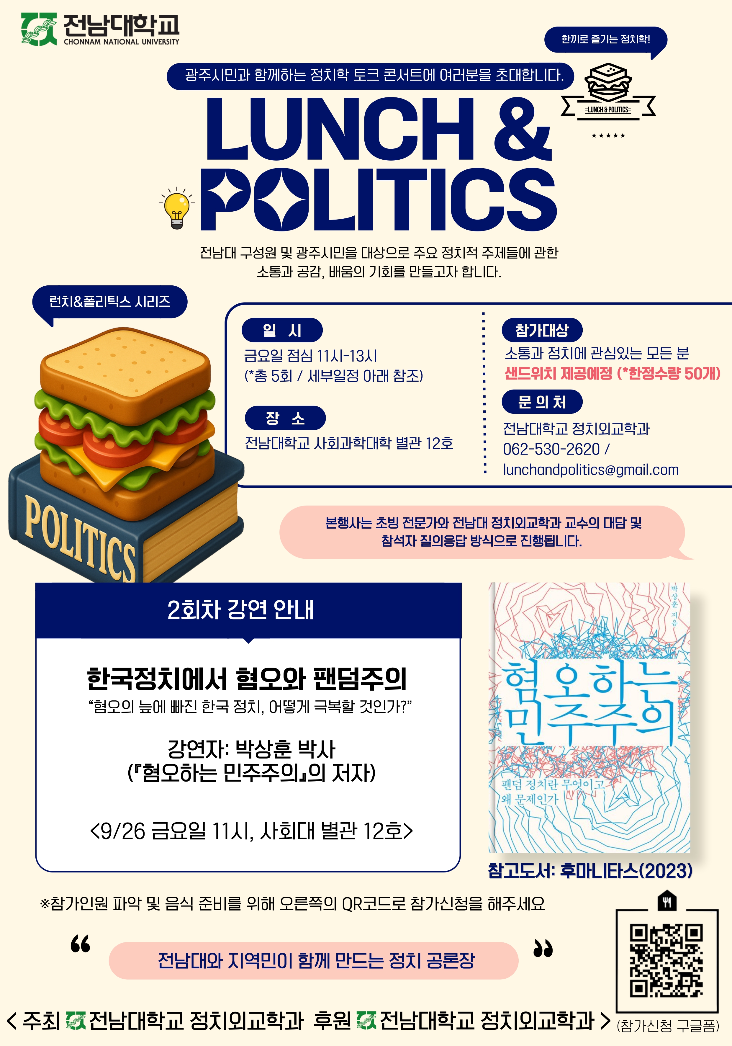 - 행사는 금요일 점심시간인 <오전 11시부터 오후 1시>까지 열리며, 참가자들에게는 간단한 점심 식사(샌드위치🥪)가 제공될 예정입니다. 행사장소는 <전남대 사회대 별관 12호>이며, <참가신청>은 구글폼(제일 아래의 링크 혹은 포스터 내 QR코드)으로 받습니다. 소통과 정치에 관심있는 학생, 직장인, 일반시민이라면 누구든 행사에 참여할 수 있으니 많은 관심 바랍니다😉