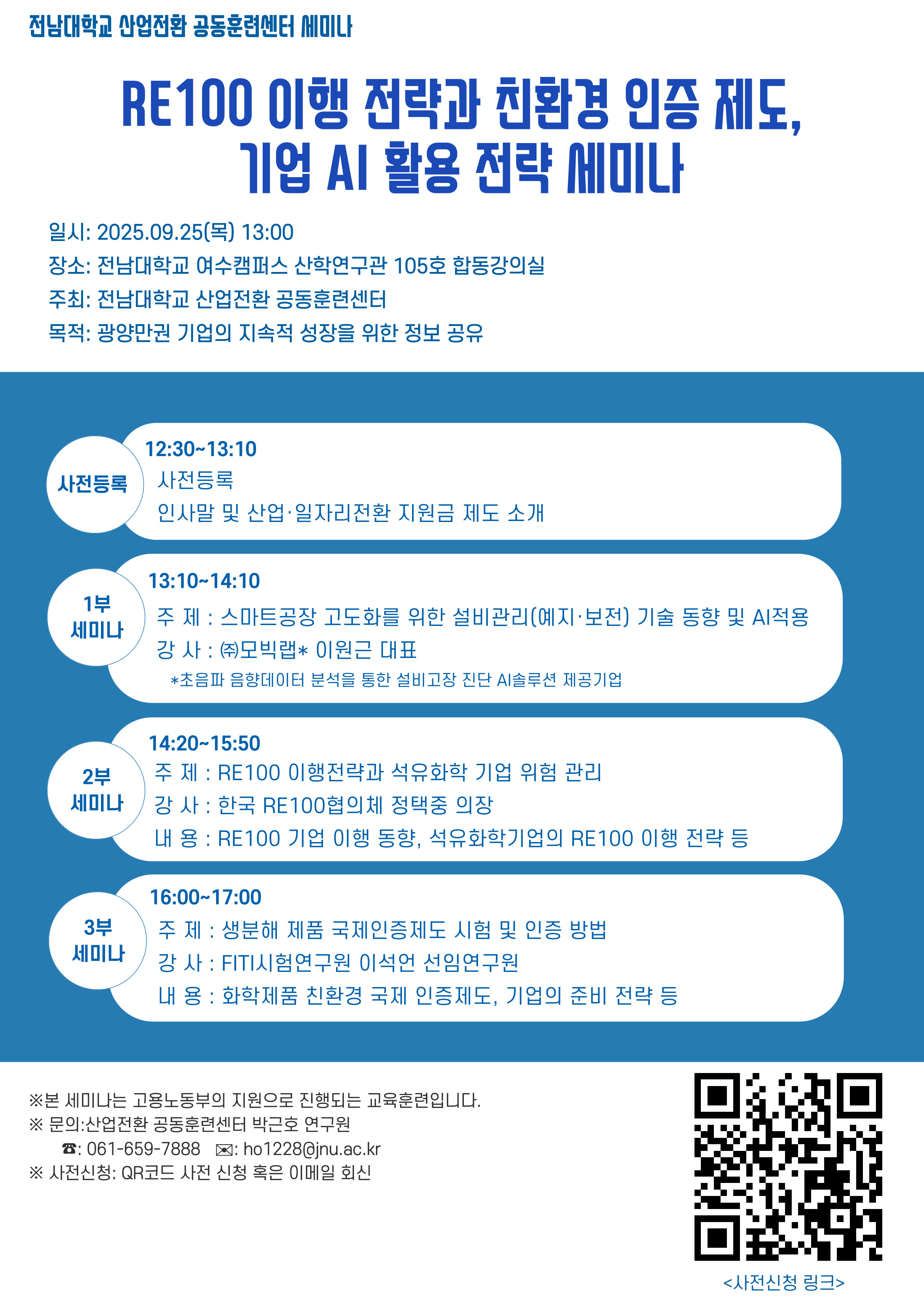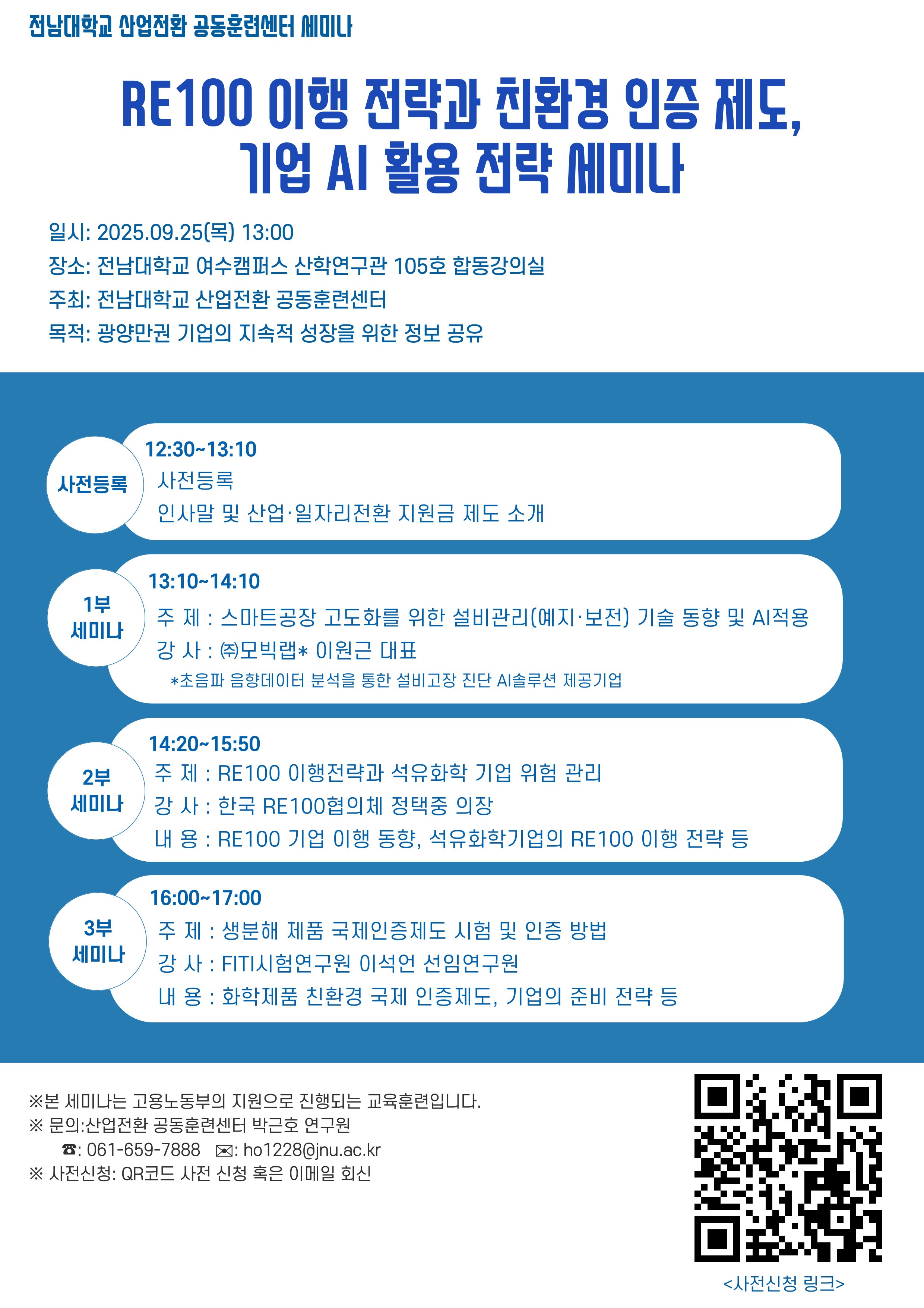 산업전환 공동훈련센터「 RE100 이행 전략과 친환경 인증 제도, 기업 AI 활용 전략 」 세미나 개최 2025.9.25.(목) 1:00PM ~ 5:00PM 전남대학교 여수캠퍼스 산학연구관 105호 합동강의실 참여대상: 전체(모든사람) 행사방식 : 오프라인(대면) 온라인 참여 링크 행사 웹사이트 방문 061-659-7888 공유하기