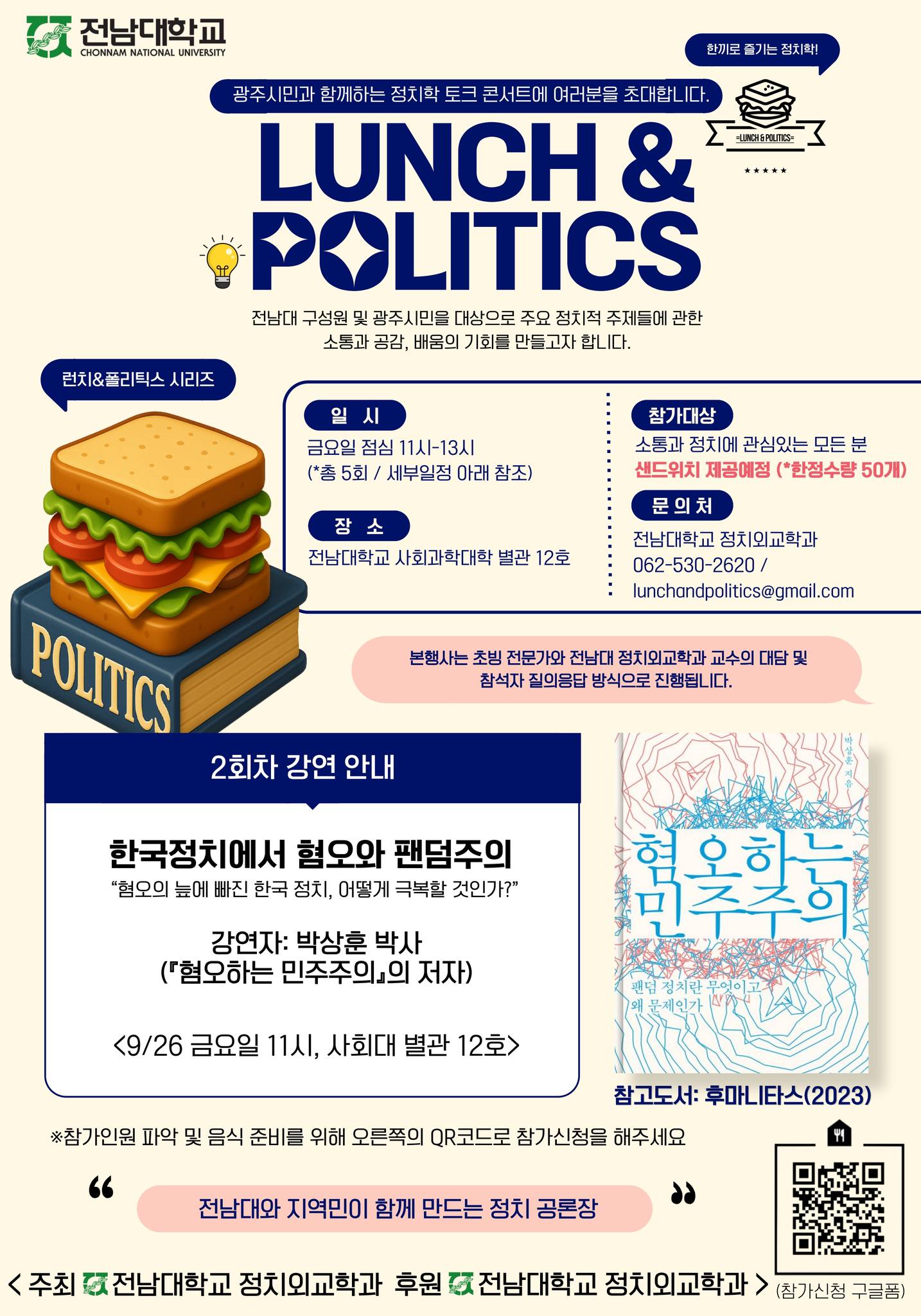 - <전남대 정치외교학과>에서 지역사회의 정치교육 및 공론장 활성화를 위해 광주시민과 함께하는 정치학 토크 콘서트 <런치&폴리틱스(Lunch&Politics)> 시리즈를 진행하고 있습니다.