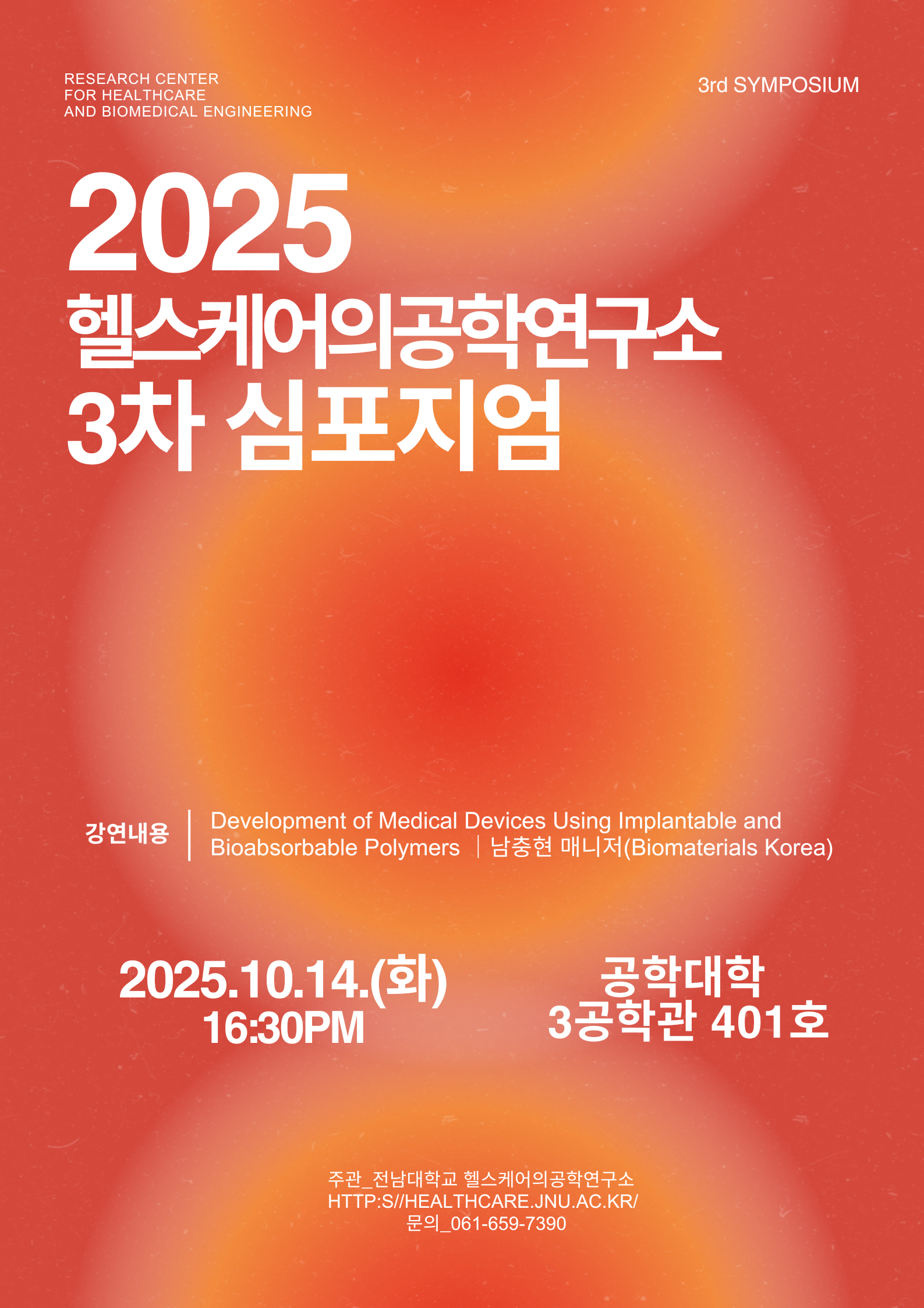 전남대학교 헬스케어의공학연구소에서는 헬스케어 의공학 기술의 발전 방향을 모색하고, 현장중심의 기술 교류를 활성화하고자 다음과 같이 2025 헬스케어의공학연구소 3차 심포지엄을 개최합니다.