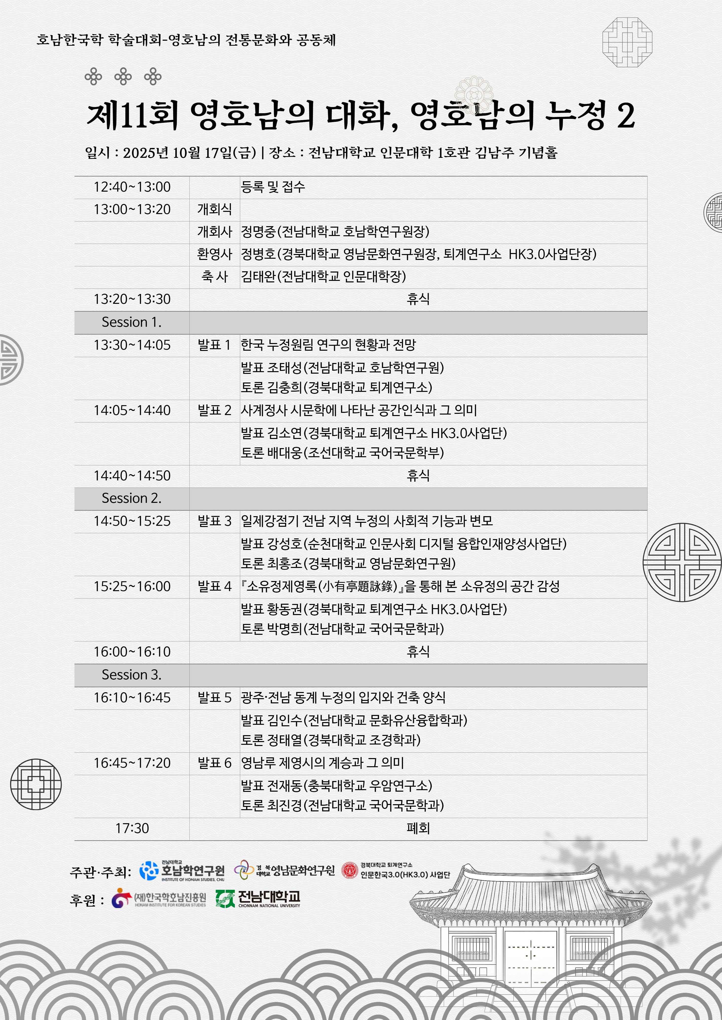 <제11회 영호남의 대화> 공동 학술대회를 개최합니다. <영호남의 대화>는 전남대학교 호남학연구원과 경북대학교 영남문화연구원이 매년 공동으로 개최하는 학술대회로, 이번에는 "영호남의 누정2"을 주제로 학술대회가 진행됩니다.
