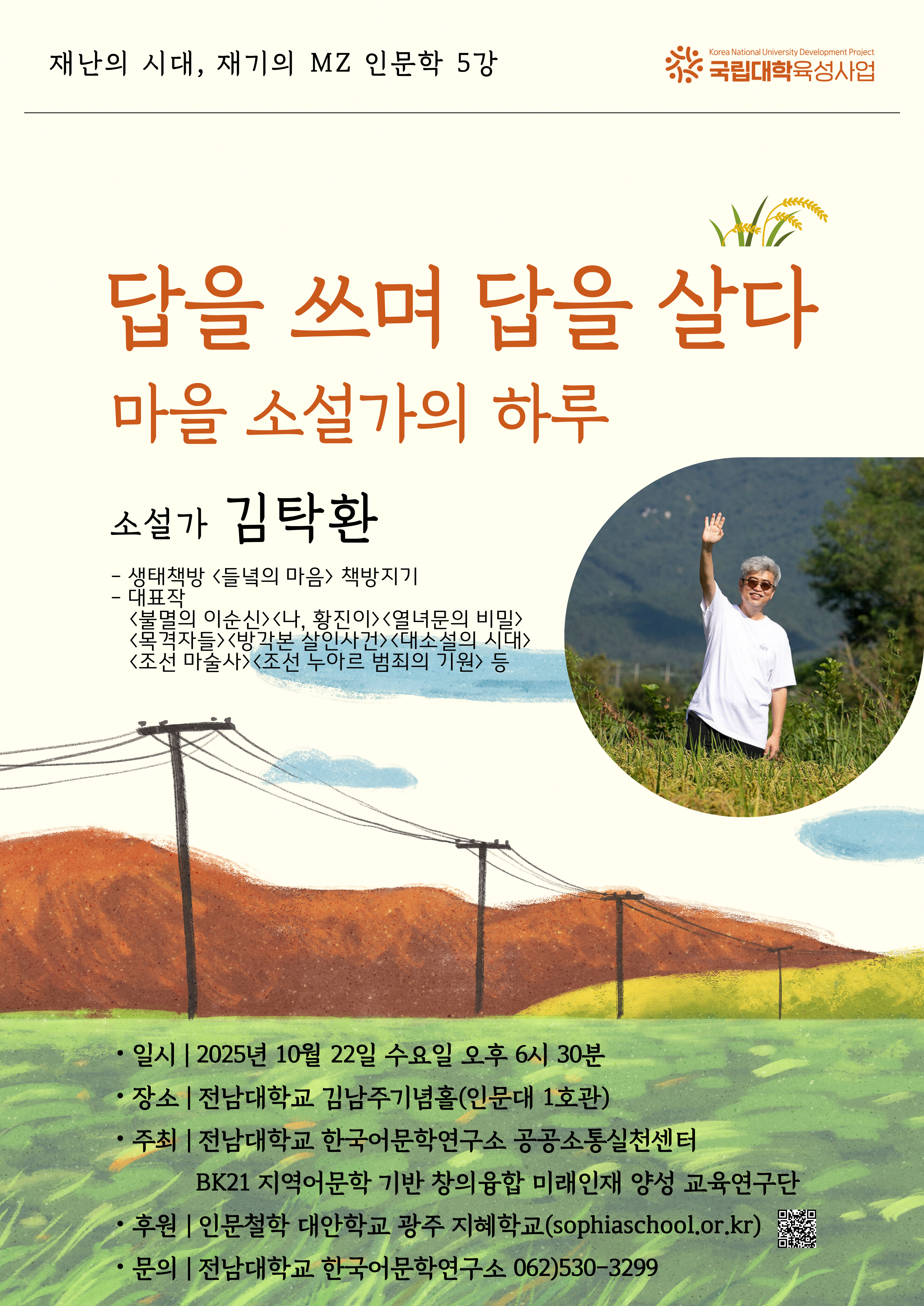 MZ 인문학 5강) 김탁환 소설가 <답을 쓰며 답을 살다-마을소설가의 하루> 2025.10.22.(수) 6:30PM ~ 8:30PM 김남주기념 참여대상: 전체(모든사람) 행사방식 : 오프라인(대면) 063)530-3299 공유하기