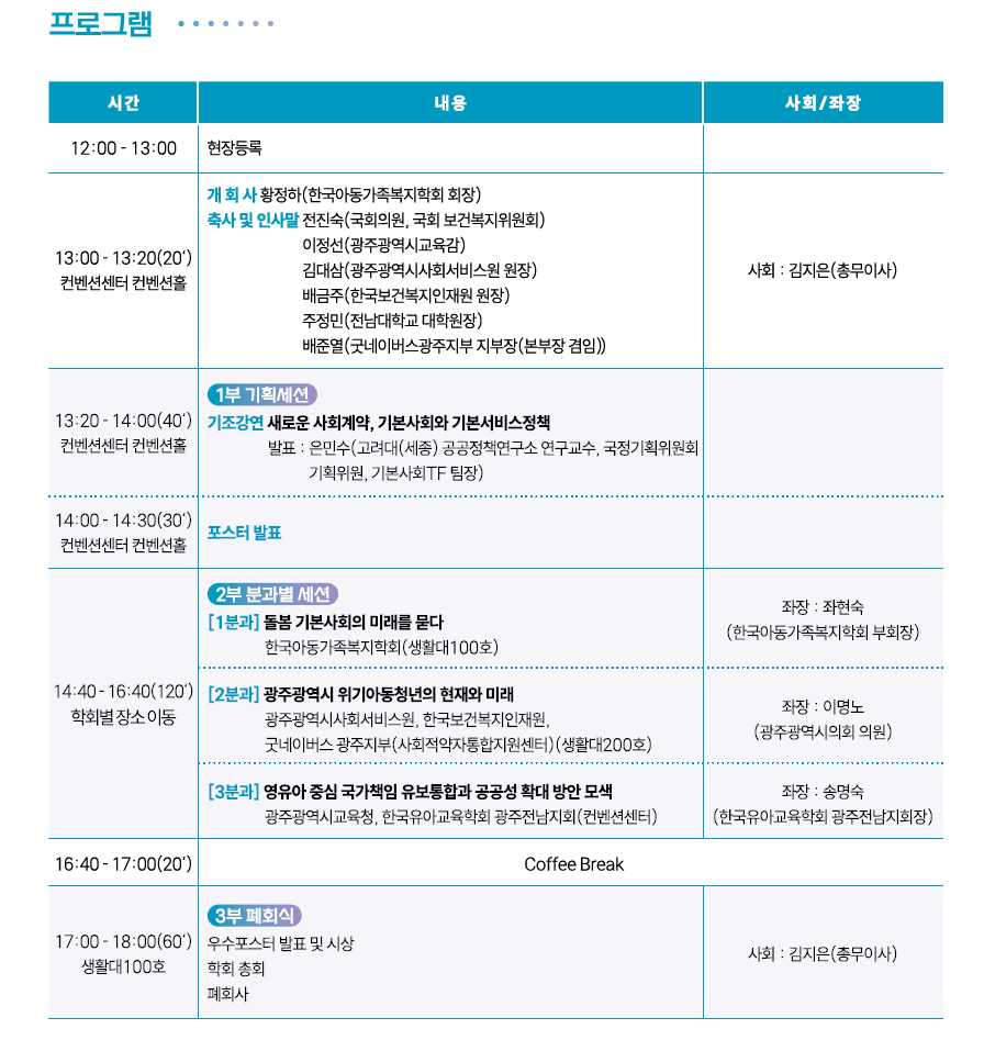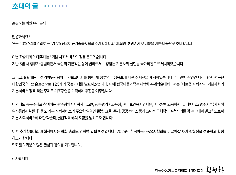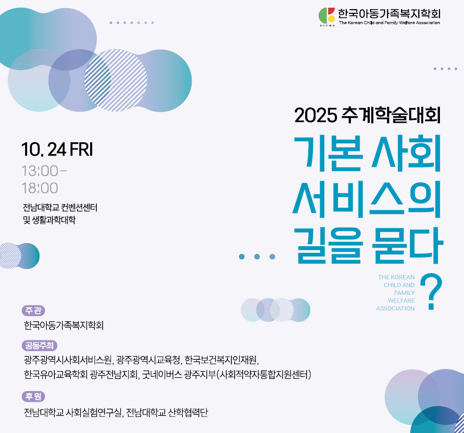 2025 한국아동가족복지학회 추계학술대회 개최 2025.10.24.(금) 1:00PM ~ 6:00PM 전남대학교 컨벤션센터 및 생활과학대학 참여대상: 전체(모든사람) 행사방식 : 오프라인(대면) 행사 웹사이트 방문 한국아동가족복지학회 / 010-2708-5100 공유하기