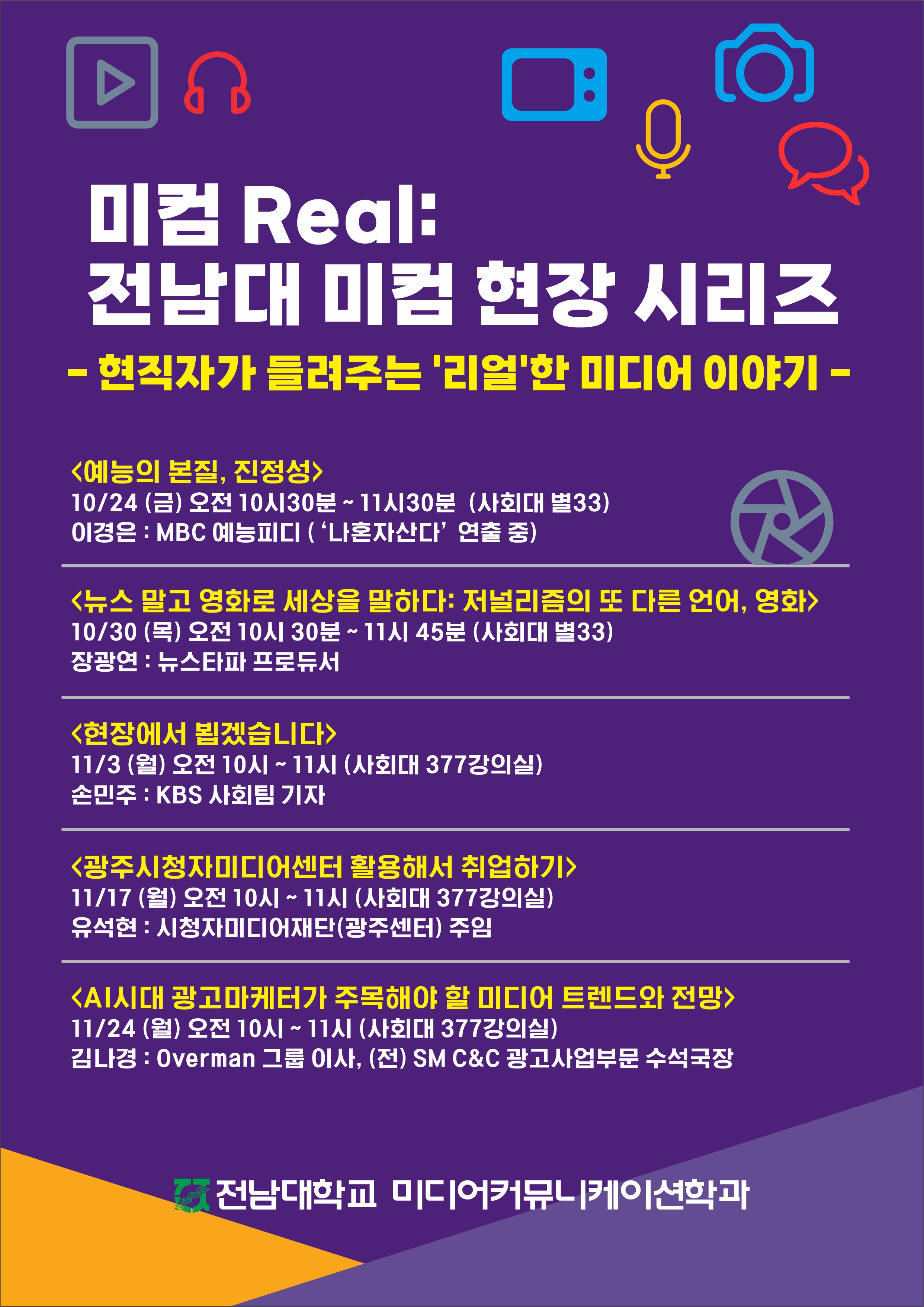 전남대 미디어커뮤니케이션학과(학과장 신우열 교수)가 '미컴 Real: 전남대 미컴 현장 시리즈'를 개최한다. 현장 전문가들이 실무 경험과 최신 트렌드, 취업 전략을 생생하게 전하는 특별 강연 시리즈이다.