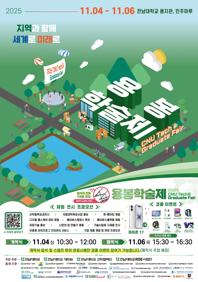‘2025 용봉학술제’는 전남대학교가 쌓아온 지식과 연구, 그리고 산업과 지역의 경험이 어우러지는 공유와 협력의 자리입니다. 대학의 최신 연구성과와 연구논문을 공유하고, 지역사회에 돌려드릴 우수한 기술과 창‧취업 아이템을 한 자리에서 살펴보고, 중개하며, 소통하는 열린 공간을 마련하고자 테크페어와 대학원 페어를 하나로 융합해 『2025 용봉학술제』를 다음과 같이 개최합니다.