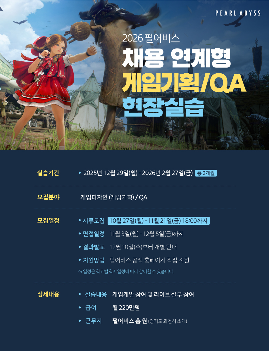 2025년 동계 ~ 2026년 1학기 펄어비스 채용연계형 현장실습학기제 참여인원을 모집합니다