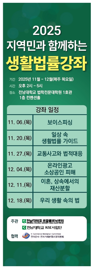 2025 지역민과 함께하는 생활법률강좌 2025.11.6.(목) ~ 2025.12.18.(목)(43일간) 전남대학교 법학전문대학원 1호관 1층 컨벤션홀 참여대상: 전체(모든사람) 행사방식 : 오프라인(대면) 0625302291 공유하기
