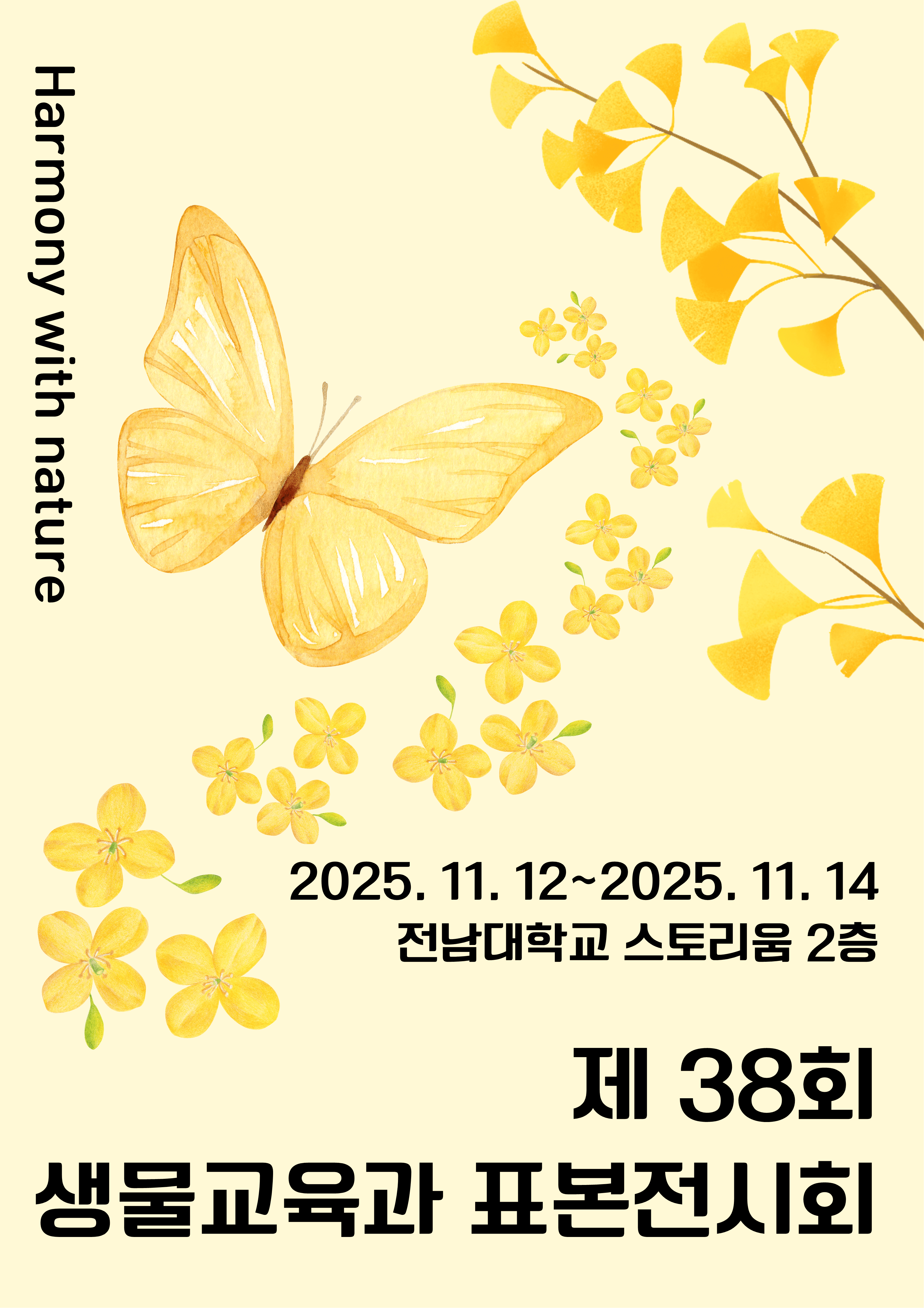 제38회 생물교육과 표본전시회 2025.11.12.(수) ~ 2025.11.14.(금)(3일간) 전남대학교 스토리움 2층 참여대상: 전체(모든사람) 행사방식 : 오프라인(대면) 공유하기