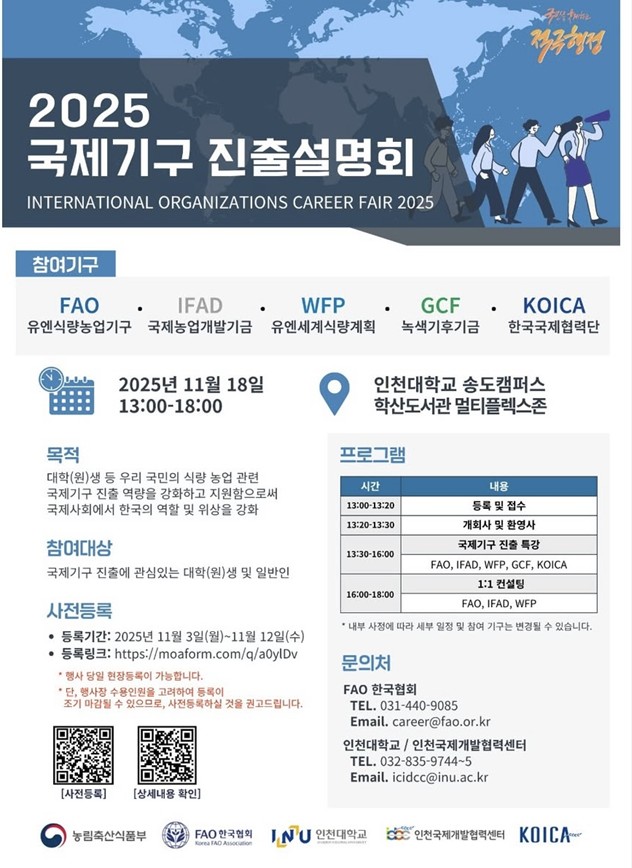 2025년 UNFAO WFP KOICA 국제기구 진출의 길 2025.11.6.(목) ~ 2025.11.18.(화)(13일간) 참여대상: 전체(모든사람) 행사방식 : 오프라인(대면) 공유하기