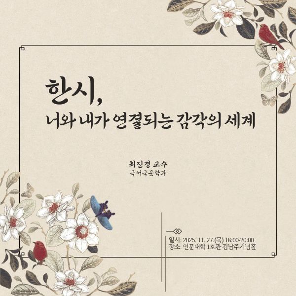 2025학년도 하반기 함께하는 인문학 제3강 2025.11.27.(목) 6:34PM ~ 8:00PM 인문대학 1호관 김남주기념홀 참여대상: 전체(모든사람) 행사방식 : 오프라인(대면) 062-530-3117 공유하기