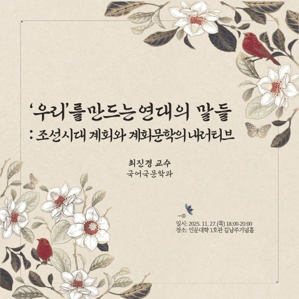 2025학년도 하반기 함께하는 인문학 제3강 2025.11.27.(목) 6:00PM ~ 8:00PM 인문대학 1호관 김남주기념홀 참여대상: 전체(모든사람) 행사방식 : 오프라인(대면) 062-530-3117 공유하기