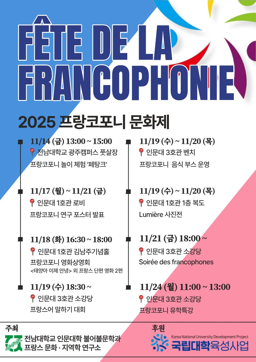전남대학교 인문대학 불어불문학과와 프랑스문화·지역학연구소는 11월, 한 달 동안 ‘2025 프랑코포니 문화제’를 개최한다. 프랑코포니 놀이 체험 ‘페탕크’를 비롯하여 프랑코포니 연구 포스터 발표, 프랑코포니 영화상영회, 프랑스어 말하기 대회, 프랑코포니 음식 부스 운영, 사진전, Soirée des francophones(불문인의 밤), 프랑코포니 유학 특강 등 프랑스어권에 관한 다채로운 행사가 펼쳐질 예정이다.
