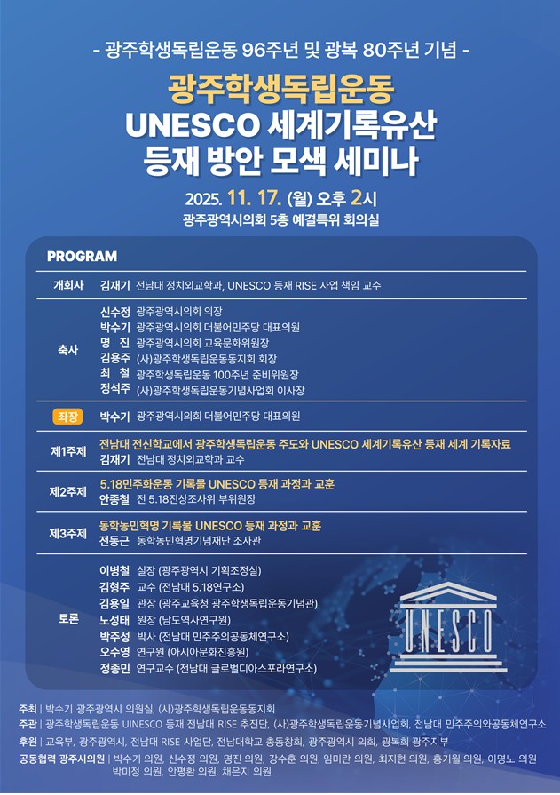 자유평등기반 광주학생독립운동 UNESCO 세계기록유산 등재 위한 회의 2025.11.12.(수) ~ 2025.11.18.(화)(7일간) 시의회 5층 예결위회의실 참여대상: 전체(모든사람) 행사방식 : 오프라인(대면) 공유하기