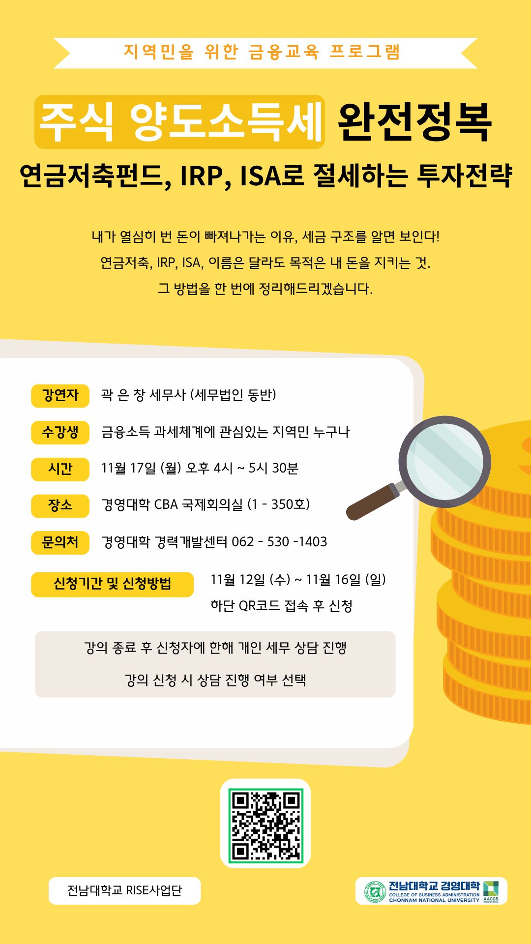 [전남대학교 RISE사업] 지역민을 위한 금융교육 프로그램 - 주식 양도소득세 완전정복 2025.11.17.(월) 4:00PM ~ 5:30PM 전남대학교 경영대학 CBA홀(1호관 350호) 참여대상: 전체(모든사람) 행사방식 : 오프라인(대면) 경영대학 경력개발센터(062-530-1403) 공유하기