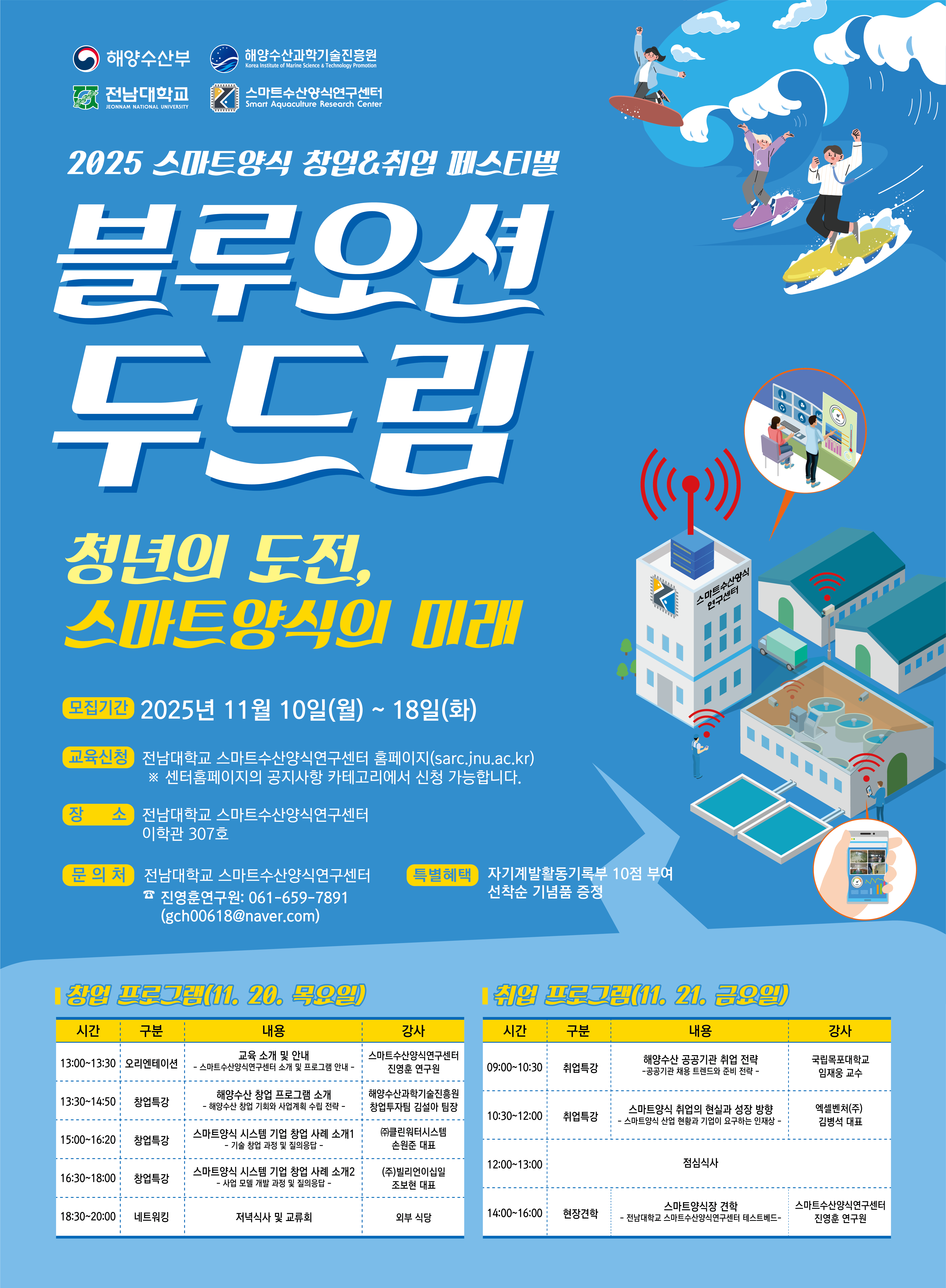 2025 스마트양식 창업&취업 페스티벌 블루오션 두드림(청년의 도전, 스마트 양식의 미래) 2025.11.12.(수) ~ 2025.11.21.(금)(10일간) 여수캠퍼스 이학관 307호 참여대상: 학생 행사방식 : 오프라인(대면) 061-659-7891 공유하기