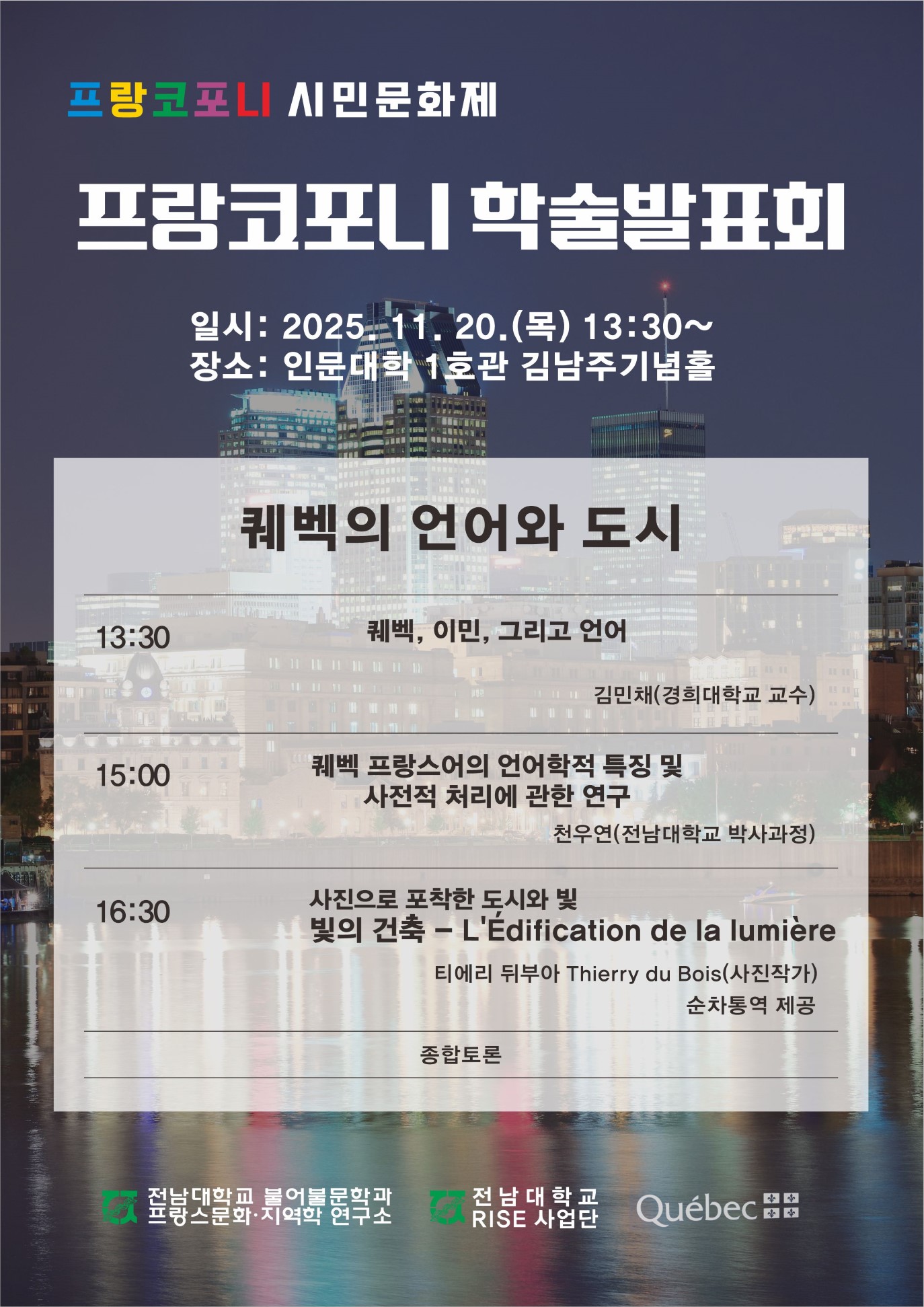 전남대학교 인문대학 불어불문학과와 프랑스문화지역학연구소에서 개최하는 프랑코포니 학술발표회 '퀘벡의 언어와 도시'에 관해 안내드립니다.