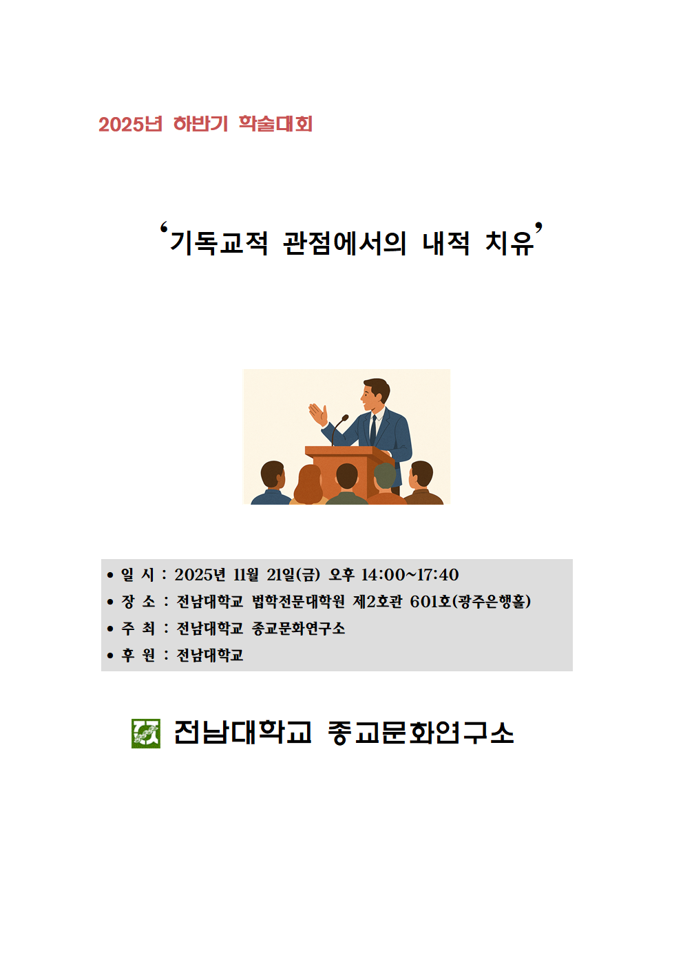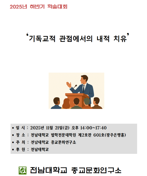 전남대학교 종교문화연구소에서는‘기독교적 관점에서의 내적 치유’라는 주제로 학술대회를 개최 합니다.
