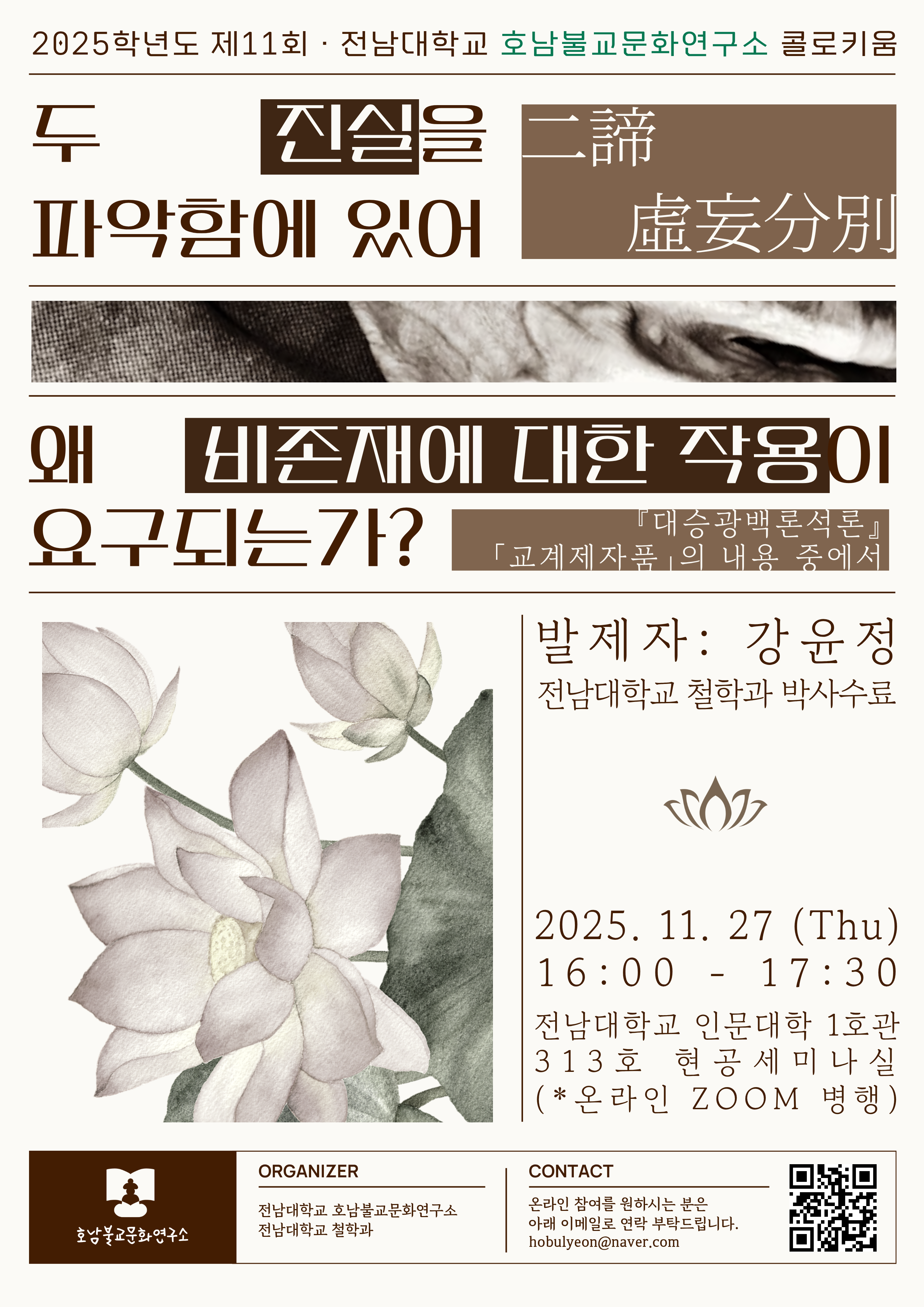 전남대학교 호남불교문화연구소는 <두 진실[二諦]을 파악함에 있어 왜 비존재에 대한 작용[虛妄分別]이 요구되는가?>라는 주제로 제11회 콜로키움을 개최합니다.