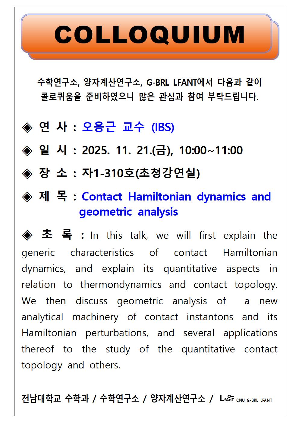 수학연구소 콜로퀴움(오용근 교수) 2025.11.21.(금) 10:00AM ~ 11:00AM 자연과학대학 1호관 310호(초청강연실) 참여대상: 전체(모든사람) 행사방식 : 오프라인(대면) 062-530-3330 공유하기