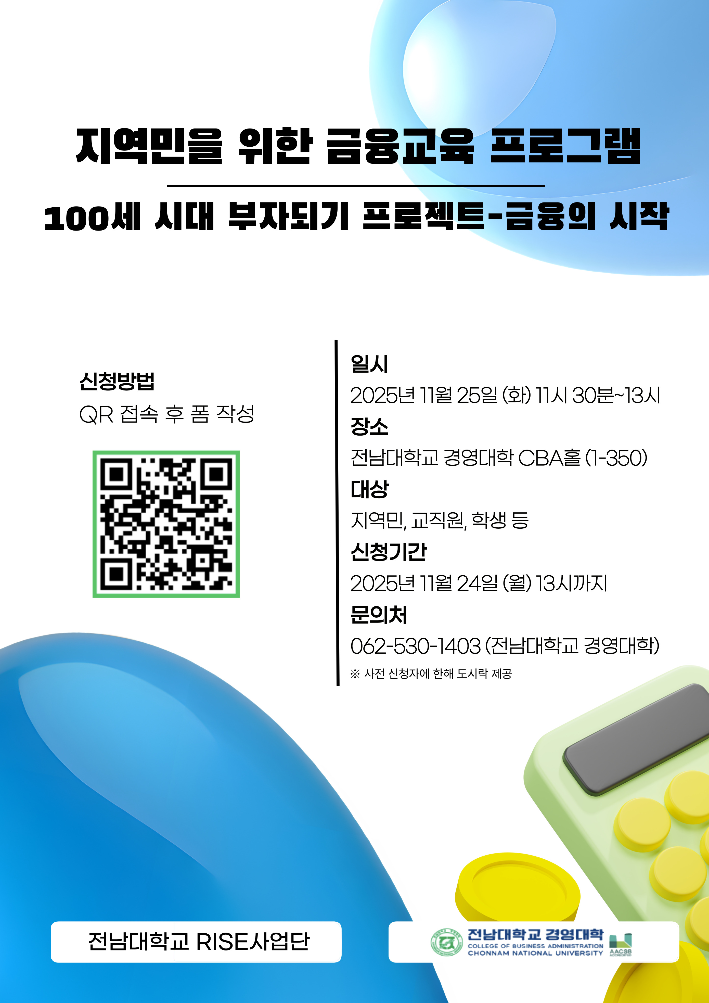 [강의/발표/토론] [전남대학교 RISE사업] 지역민을 위한 금융교육 프로그램 - 100세 시대 부자되기 프로젝트 강의 2025.11.25.(화) 11:30AM ~ 1:00PM 경영대학 CBA홀(1-350호) 참여대상: 전체(모든사람) 행사방식 : 오프라인(대면) 전남대학교 경영대학(062-530-1403) 공유하기