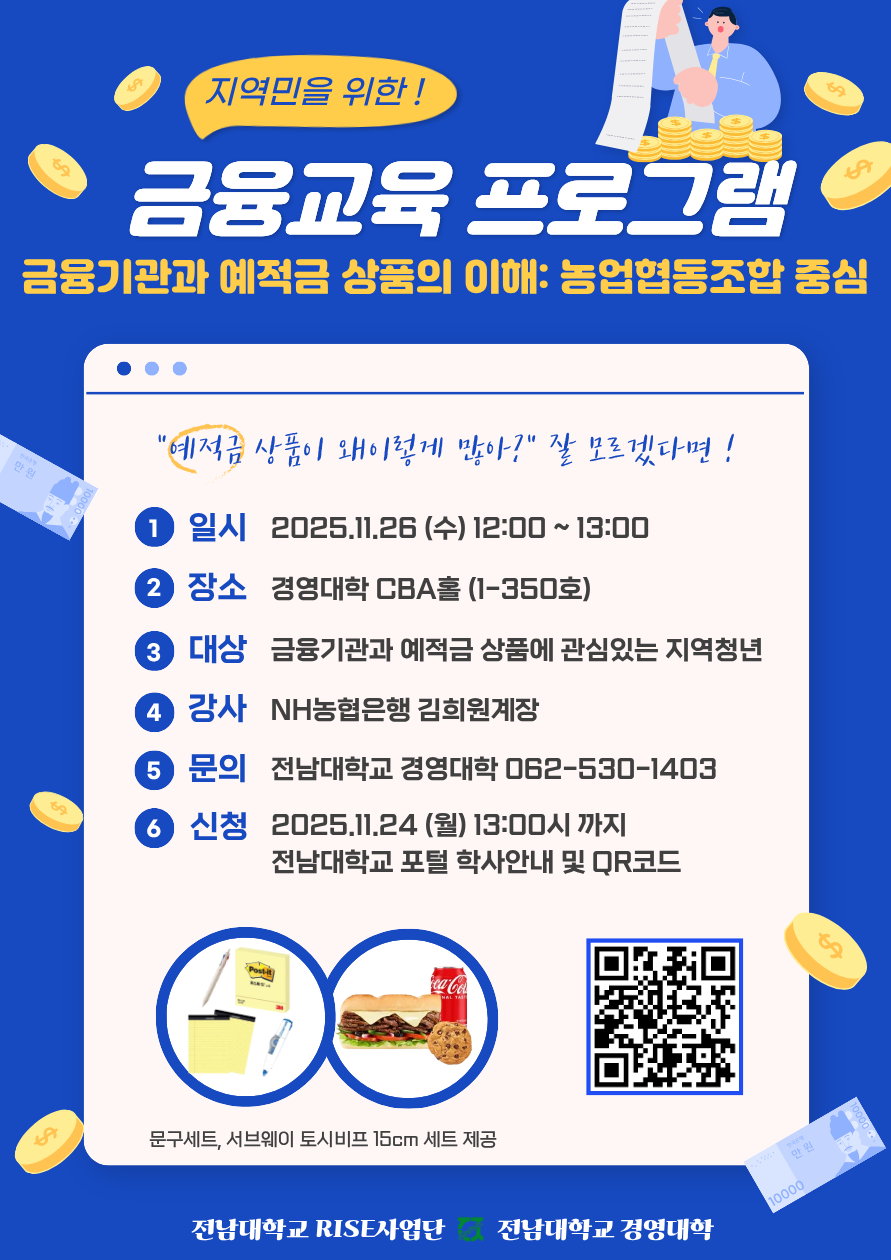 [강의/발표/토론] [전남대학교 RISE사업] 지역민을 위한 금융교육 프로그램 - 금융기관과 예적금 상품의 이해 2025.11.26.(수) 참여대상: 전체(모든사람) 행사방식 : 오프라인(대면) 전남대학교 경영대학(062-530-1403) 공유하기
