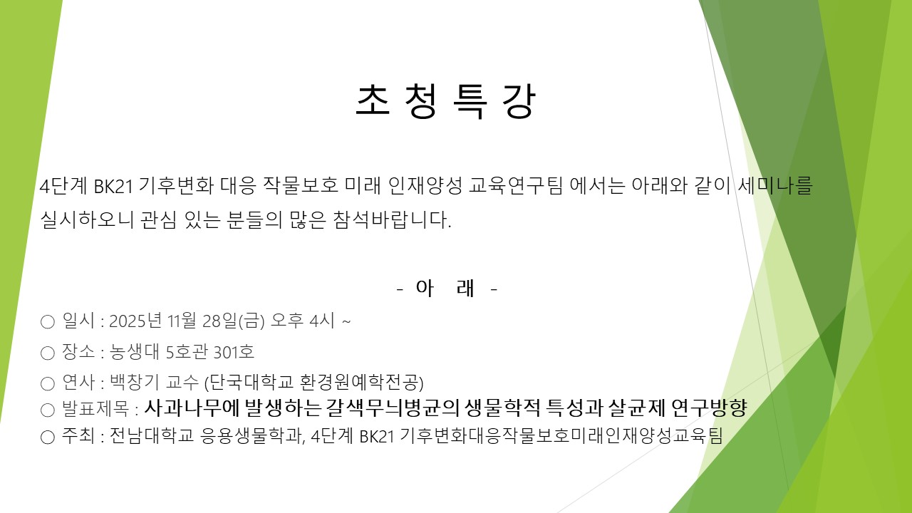 ○ 주최 : 전남대학교 응용생물학과, 4단계 BK21 기후변화 대응 작물보호 미래 인재양성 교육연구팀