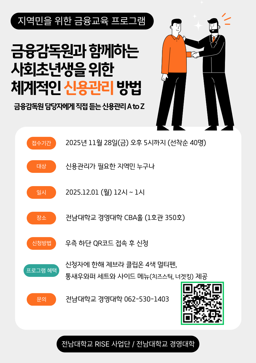 [전남대학교 RISE사업] 지역민을 위한 금융교육 프로그램 - 사회초년생을 위한 체계적인 신용관리 방법 2025.12.1.(월) 12:00PM ~ 1:00PM 경영대학 1호관 350호 참여대상: 전체(모든사람) 행사방식 : 오프라인(대면) 전남대학교 경영대학(062-530-1403) 공유하기