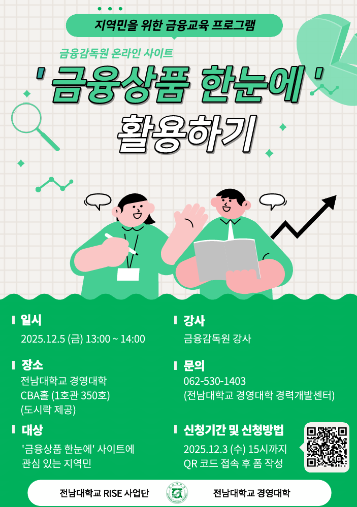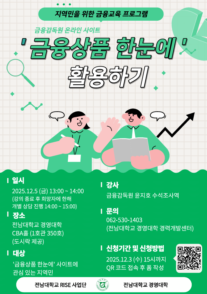 [전남대학교 RISE사업] 지역민을 위한 금융교육 프로그램 - 금융상품 한눈에 활용하기(금융감독원 사이트) 2025.12.5.(금) 1:00PM ~ 2:00PM 전남대학교 경영대학 CBA홀(1-350호) 참여대상: 전체(모든사람) 행사방식 : 오프라인(대면) 전남대학교 경영대학(062-530-1403) 공유하기
