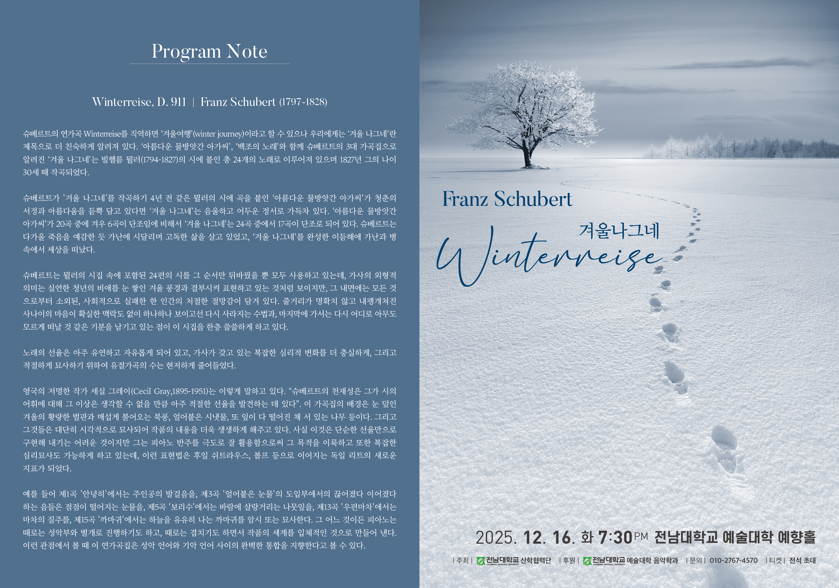 실연한 청년이 이별의 고통을 안고 추운 겨울에 정처없이 여행을 떠나며 (Winterreise-Winter Journey) 느끼는 삶의 허무함과 고독, 안식에 공감하면서 한해를 정리하는 시간 가져보시기 바랍니다.