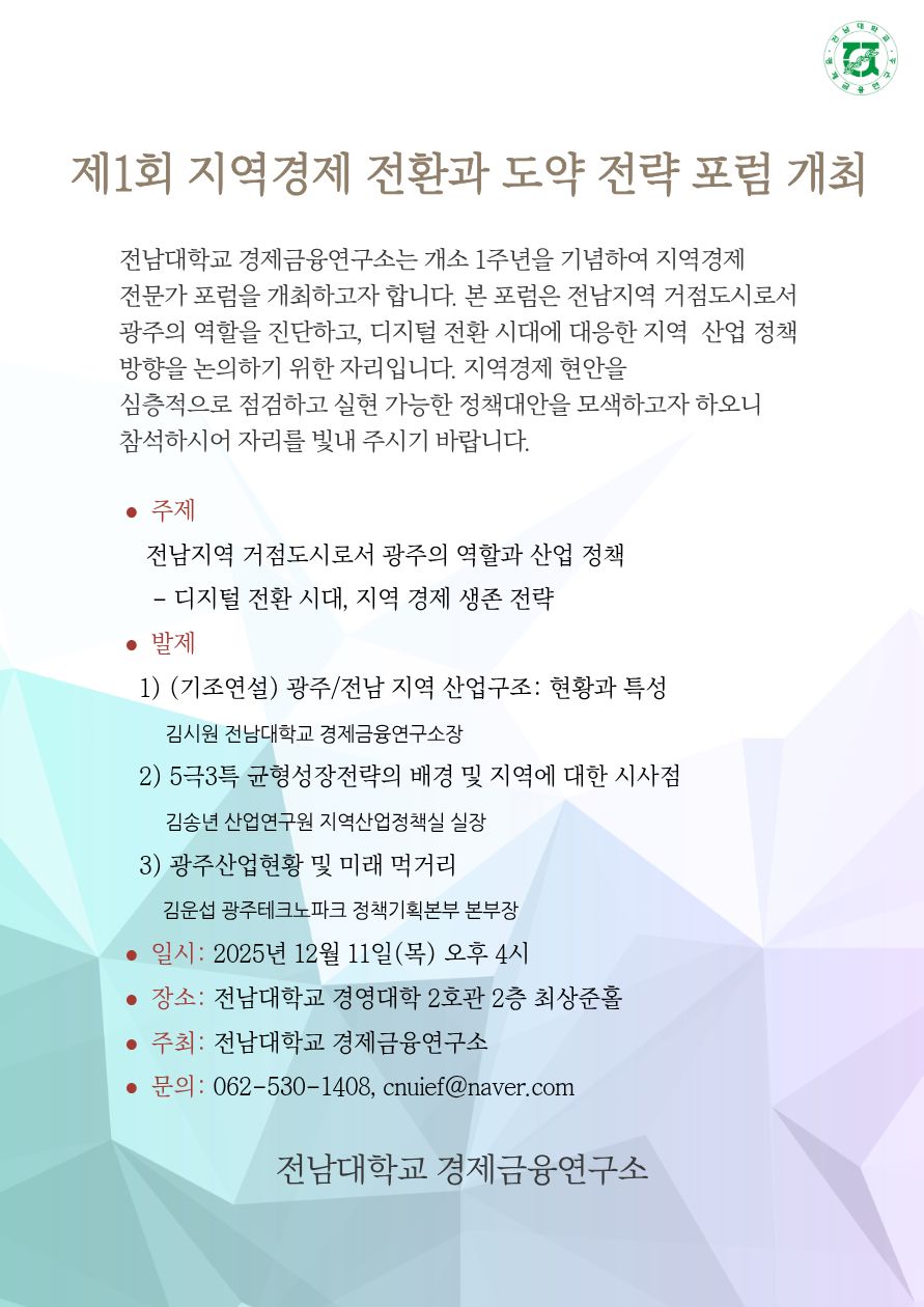 제1회 지역경제 전환과 도약 전략 포럼 개최 2025.12.11.(목) 4:00PM ~ 6:00PM 전남대학교 경영대학 2호관 2층 최상준홀 참여대상: 전체(모든사람) 행사방식 : 오프라인(대면) 062-530-1408 공유하기