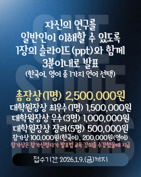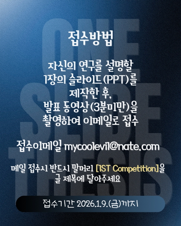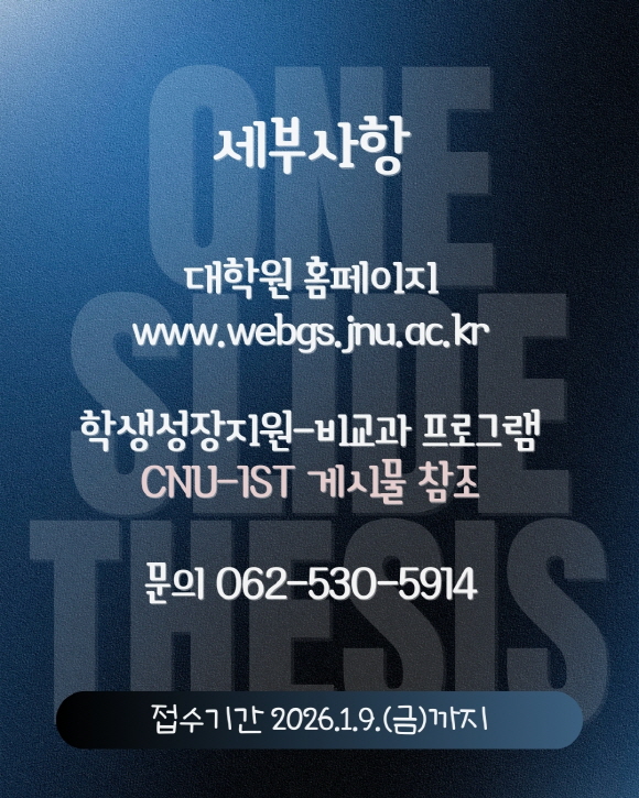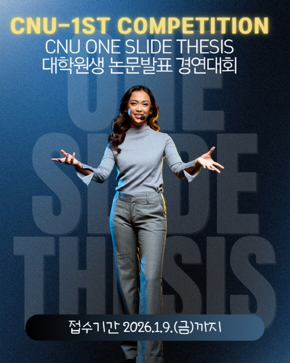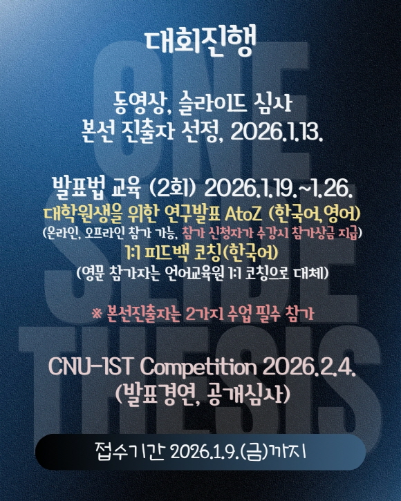 CNU-1ST Competiton 한국어 안내 2025.12.3.(수) ~ 2026.1.9.(금)(38일간) 참여대상: 학생 행사방식 : 혼합 방식 (대면 및 온라인) 온라인 참여 링크 행사 웹사이트 방문 062-530-5914 공유하기