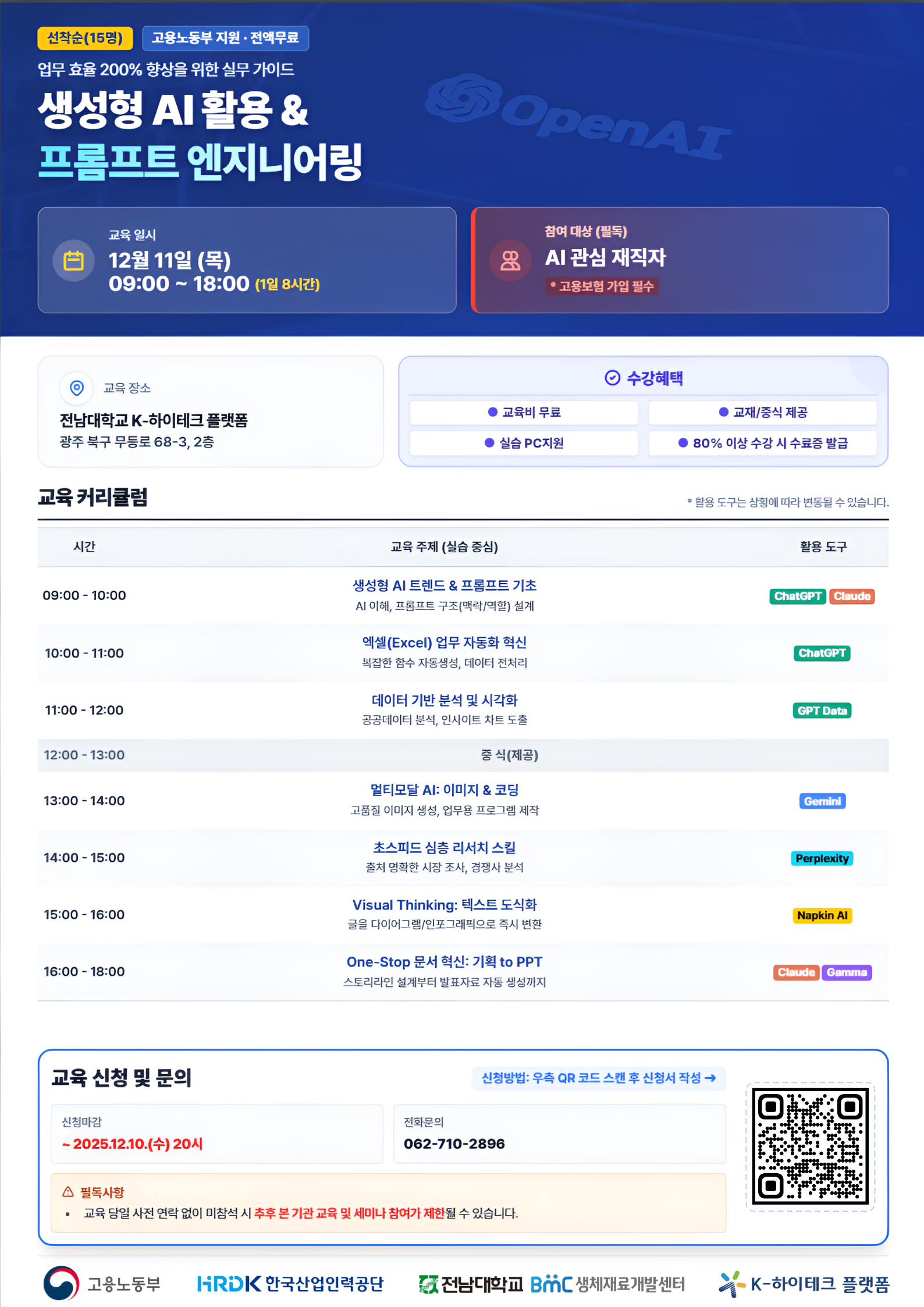 디지털 신기술 발전에 기여하고자 '생성형AI 실무' 무료교육을 운영하오니 많은 관심과 참여 부탁드립니다.