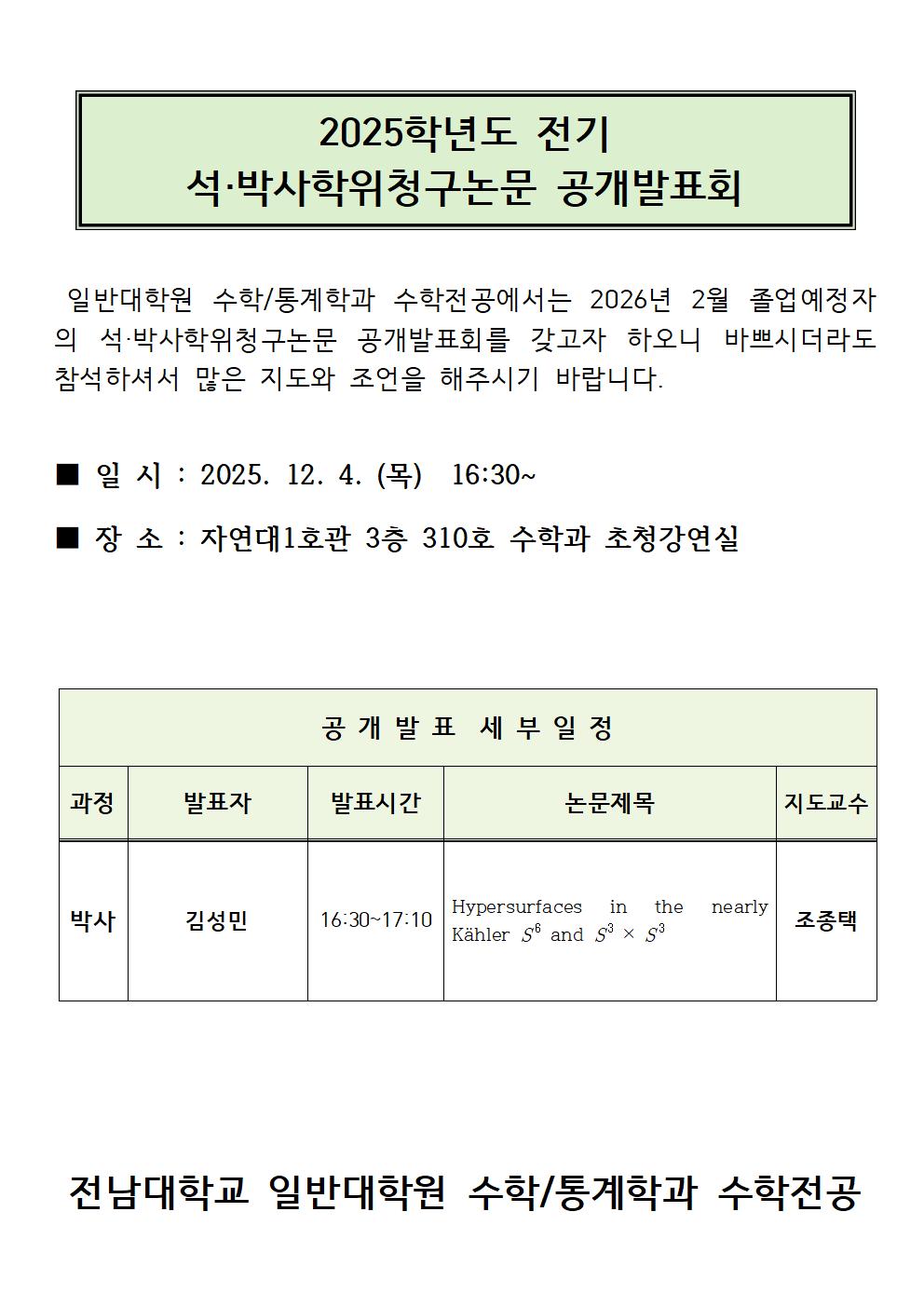 일반대학원 수학/통계학과 수학전공에서는 2026년 2월 졸업예정자의 석·박사학위청구논문 공개발표회를 갖고자 하오니 바쁘시더라도 참석하셔서 많은 지도와 조언을 해주시기 바랍니다.