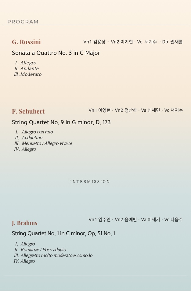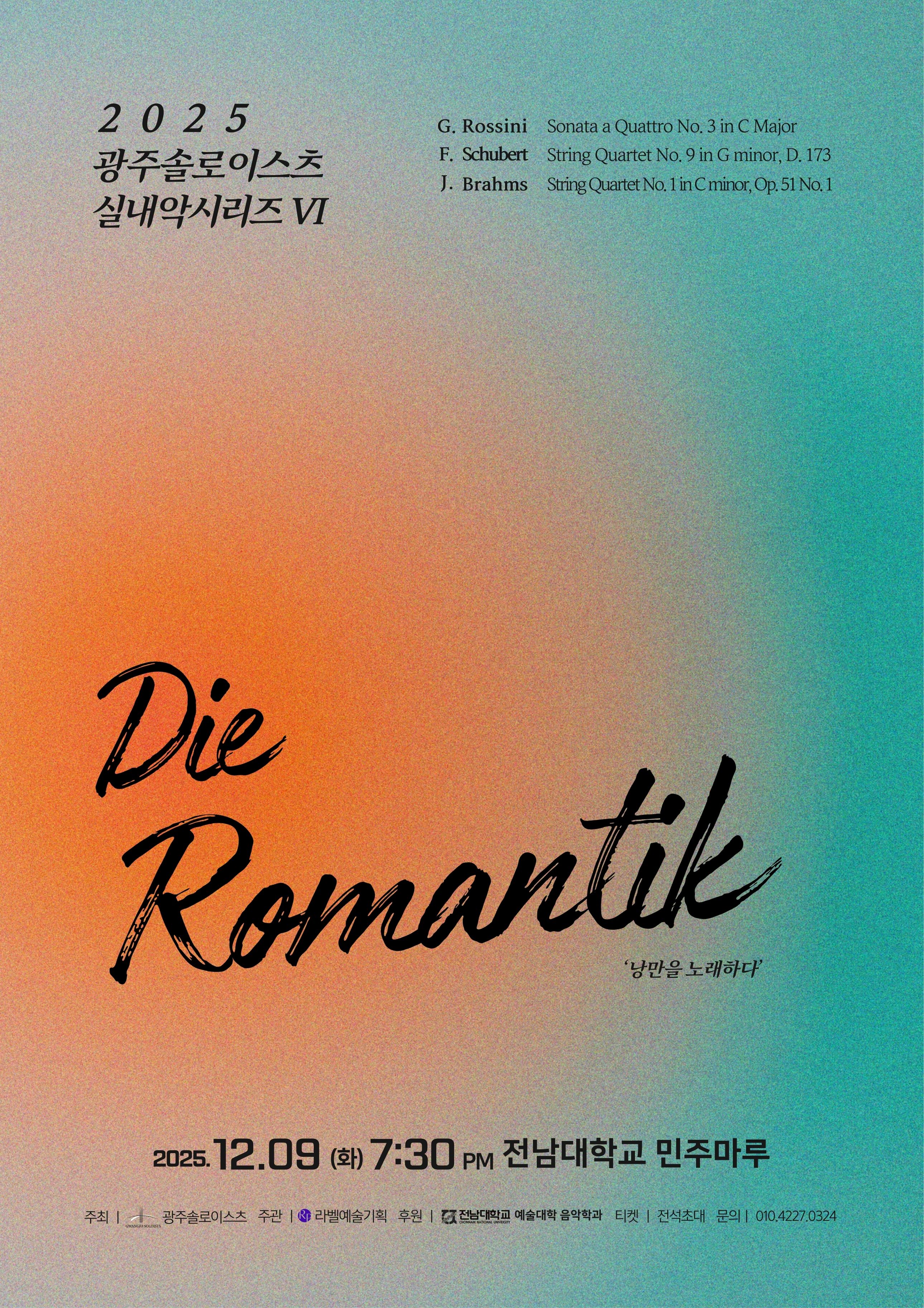 광주 솔로이스츠 제6회 실내악 시리즈 연주 2025.12.9.(화) 7:30PM ~ 9:00PM 전남대학교 민주마루 참여대상: 전체(모든사람) 행사방식 : 오프라인(대면) 01042270324 공유하기