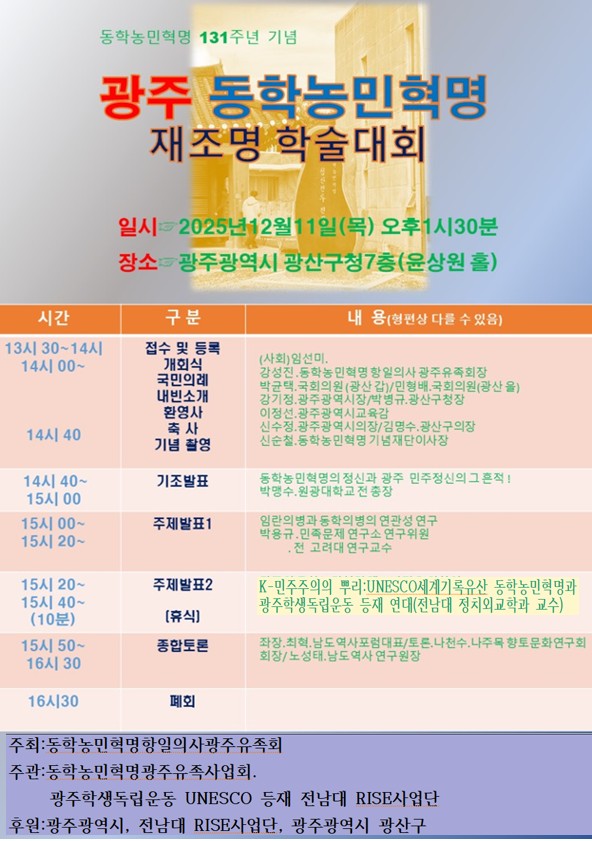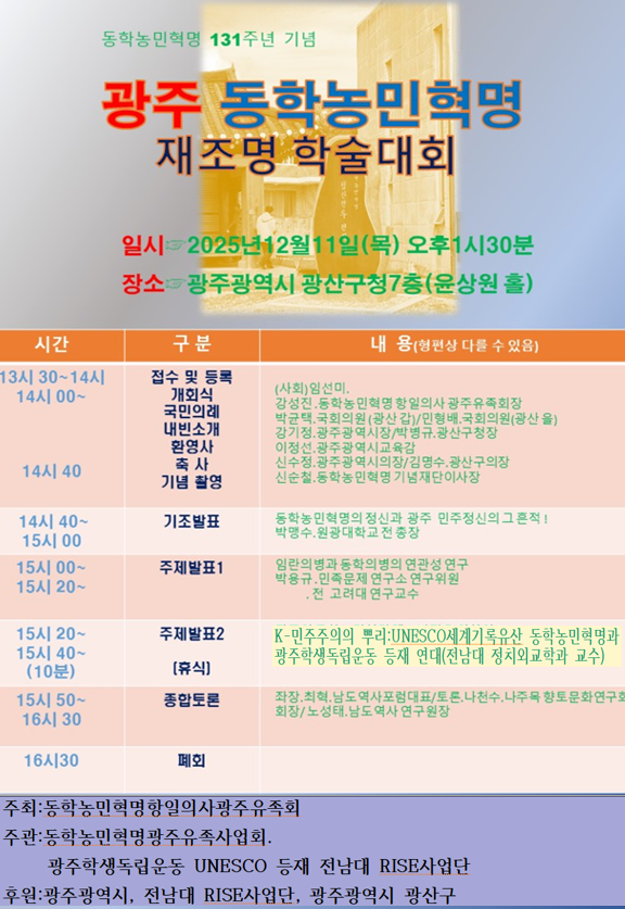 K-민주주의 뿌리:UNESCO등재 동학농민혁명에서 광주학생독립운동 등재 연대 2025.12.8.(월) ~ 2025.12.13.(토)(6일간) 광산구청 윤상원홀 참여대상: 전체(모든사람) 행사방식 : 오프라인(대면) 공유하기