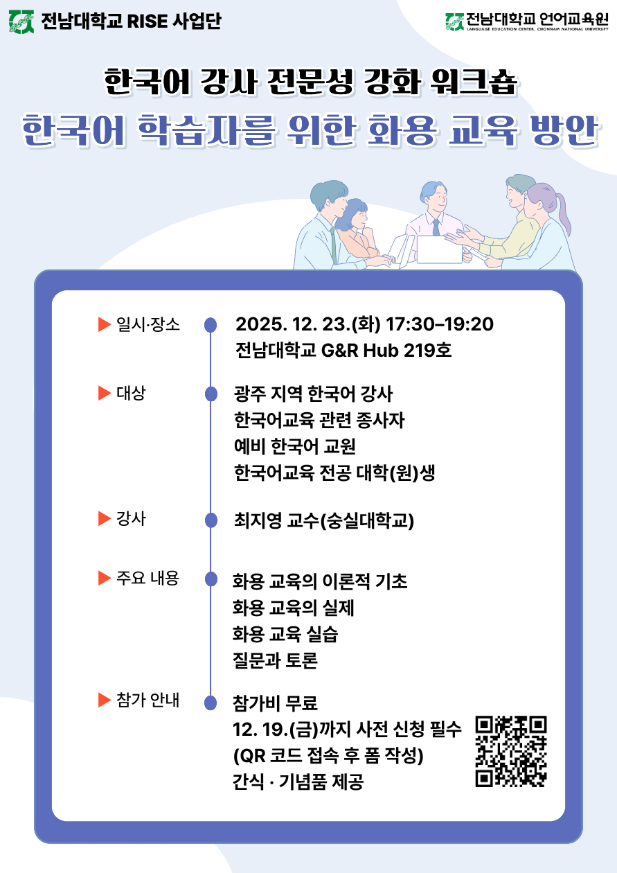 [전남대학교 RISE 사업단] 한국어 강사 전문성 강화 워크숍: 한국어 학습자를 위한 화용 교육 방안 2025.12.23.(화) 5:30PM ~ 7:20PM 전남대학교 G&R HUB 219호 참여대상: 전체(모든사람) 행사방식 : 오프라인(대면) 062-530-3621 공유하기