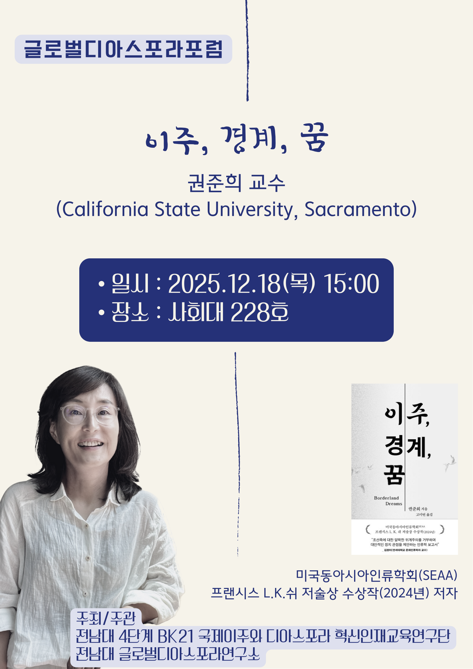 캘리포니아 주립대 권준희(문화인류학) 교수 초청 특강 <이주, 경계, 꿈> 2025.12.18.(목) 3:00PM ~ 4:30PM 사회대 228호 참여대상: 전체(모든사람) 행사방식 : 오프라인(대면) 062-530-2706 공유하기