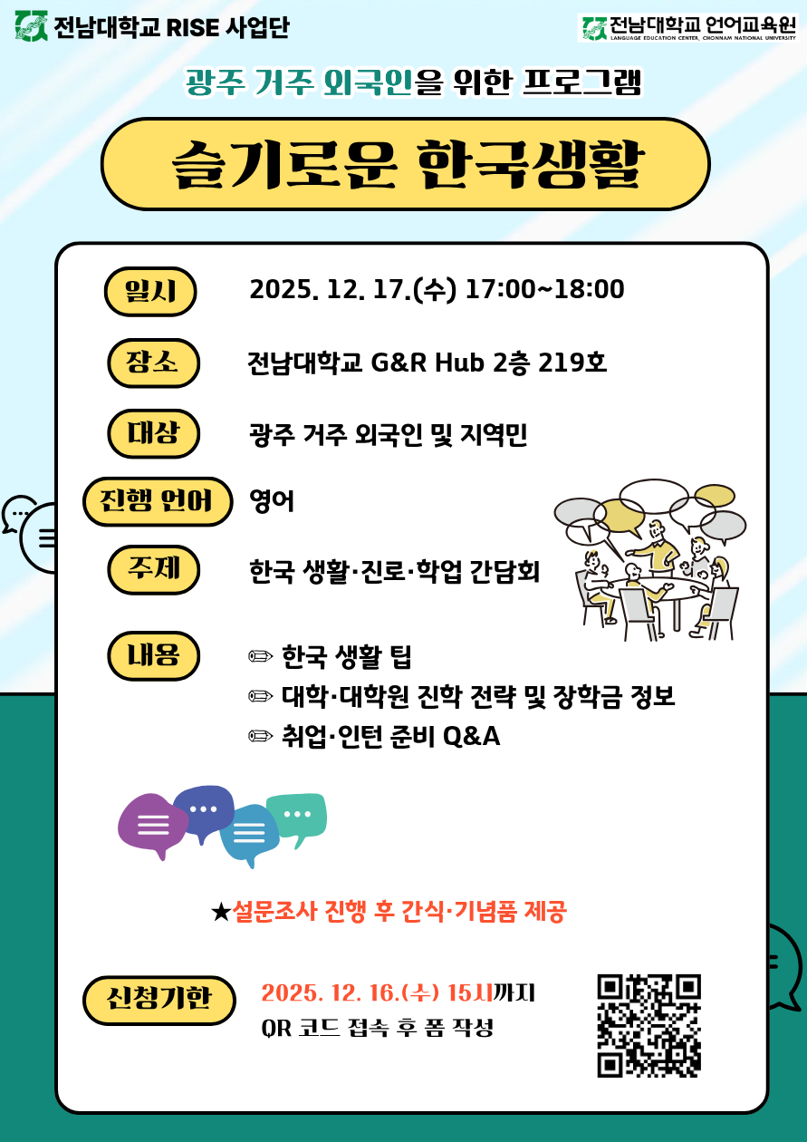 [전남대학교 RISE 사업] 광주 거주 외국인을 위한 프로그램 - 슬기로운 한국 생활 2025.12.17.(수) 5:00PM ~ 6:00PM 전남대학교 G&R HUB 2층 219호 참여대상: 전체(모든사람) 행사방식 : 오프라인(대면) 062-530-3632 공유하기