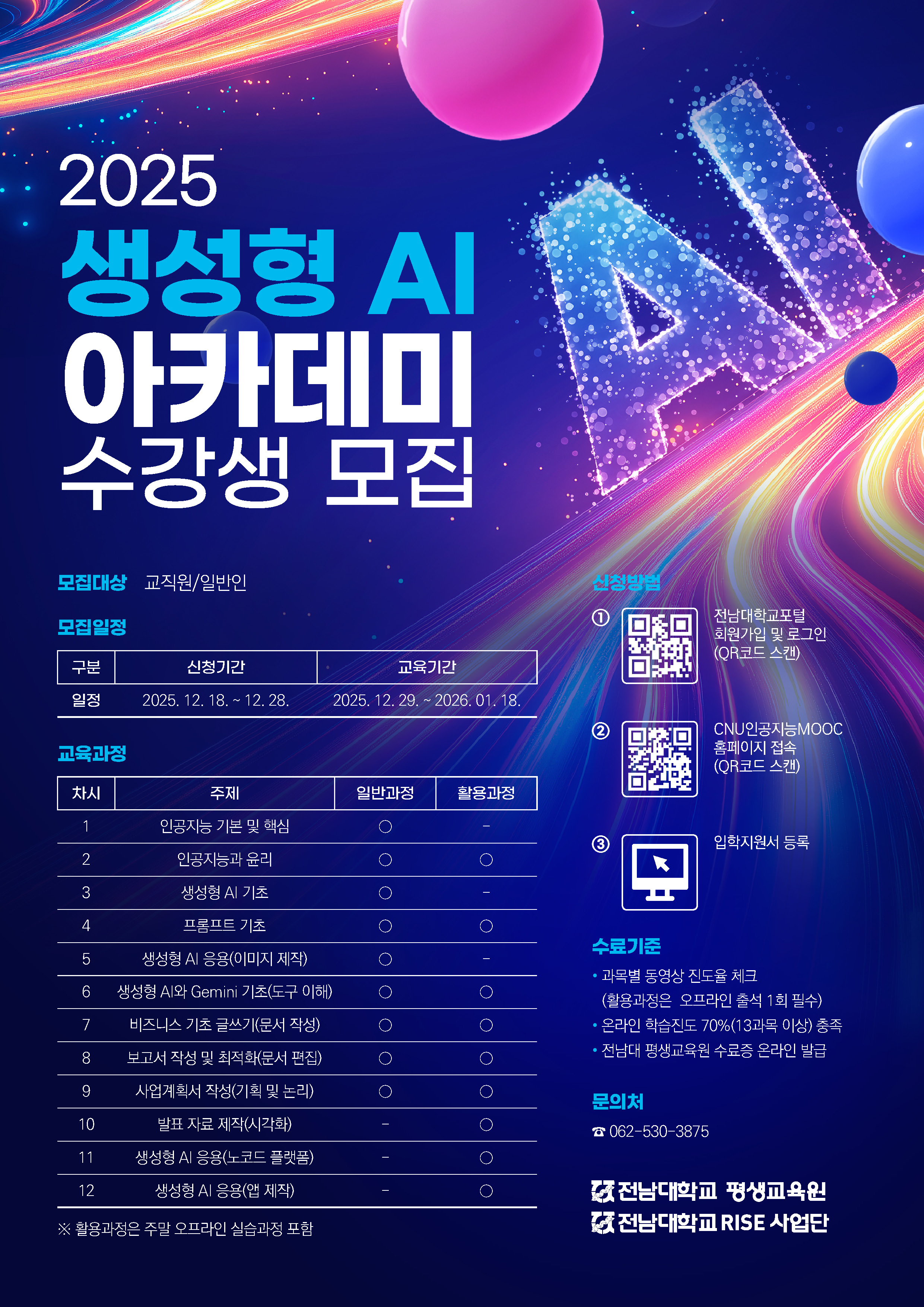 전남대학교 평생교육원에서는 급변하는 인공지능 사회변화에 대응하고자 인공지능(AI)의 기초 소양 교육을 보급하고 활성화하기 위하여 '생성형 AI 아카데미' 무료 교육을 운영하고자 수강생을 모집하오니 많은 관심과 참여 부탁드립니다.