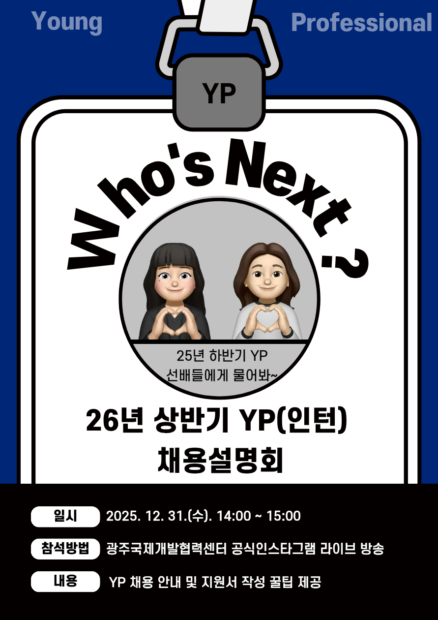 (KOICA 개발협력 사업수행기관) 광주국제개발협력센터에서 26년 상반기 YP(인턴) 채용설명회를 진행합니다.