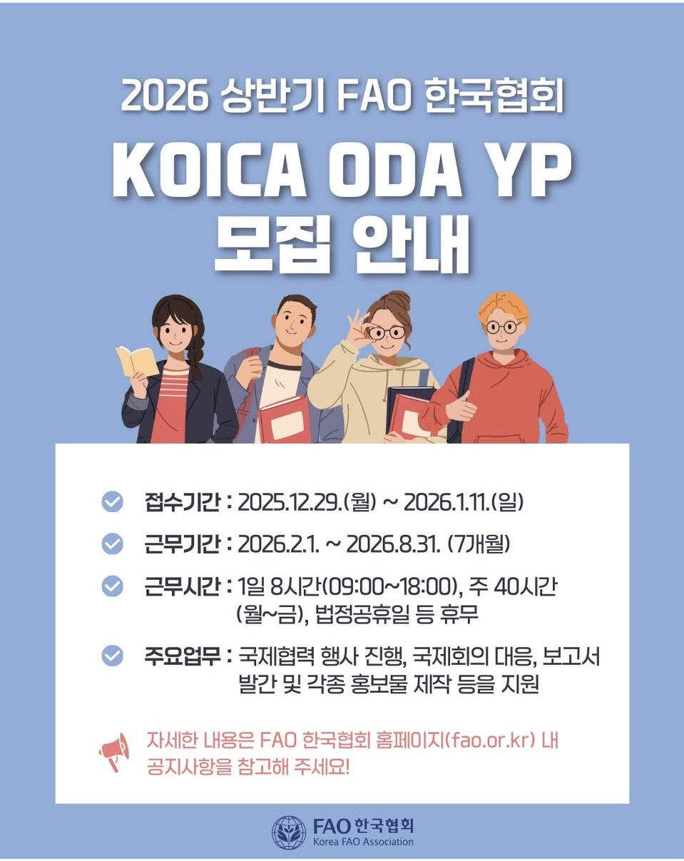 AI융합대 국제개발협력학 KOICA 지원 UNFAO YP 모집 안내 2025.12.30.(화) ~ 2026.1.8.(목)(10일간) FAO 참여대상: 전체(모든사람) 행사방식 : 오프라인(대면) 공유하기