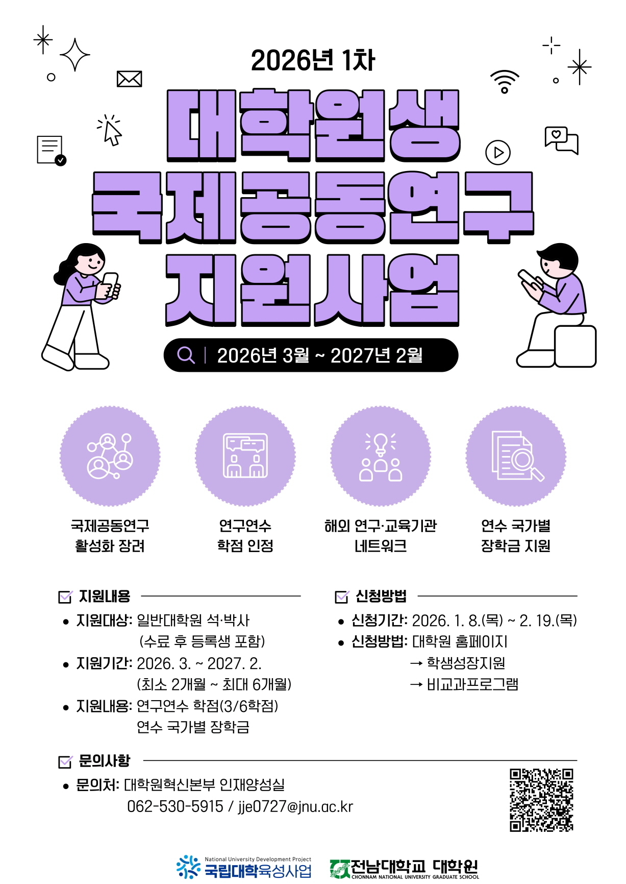 대학원생 국제공동연구를 적극 응원하기 위해 2026학년도 1차 대학원생 국제공동연구 지원사업 참여자를 모집합니다.