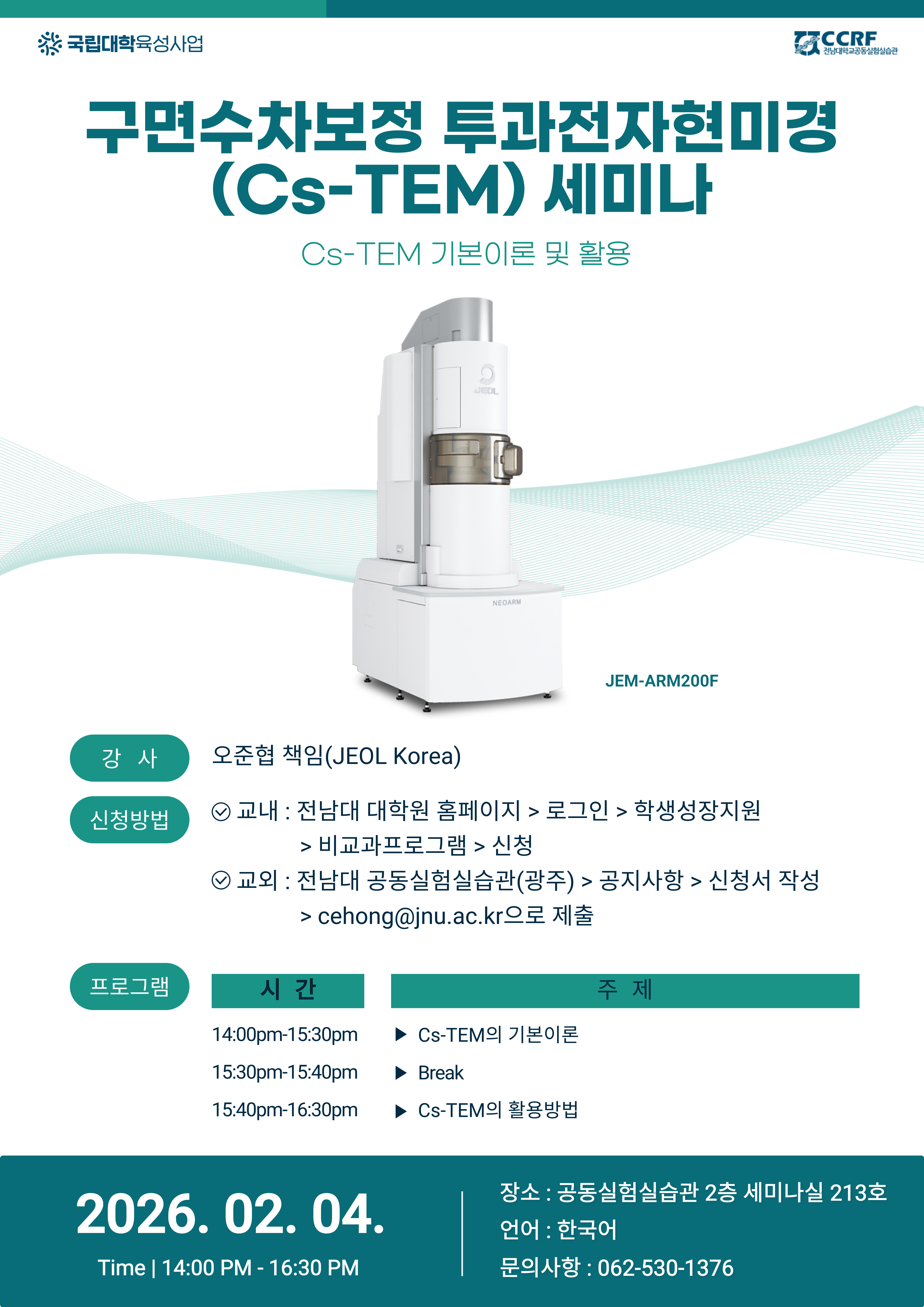 본 세미나에서는 구면수차보정 투과전자현미경(Cs-TEM) 기초 이론 및 활용방안에 대해 설명할 예정이오니, 많은 관심과 참가 바랍니다.