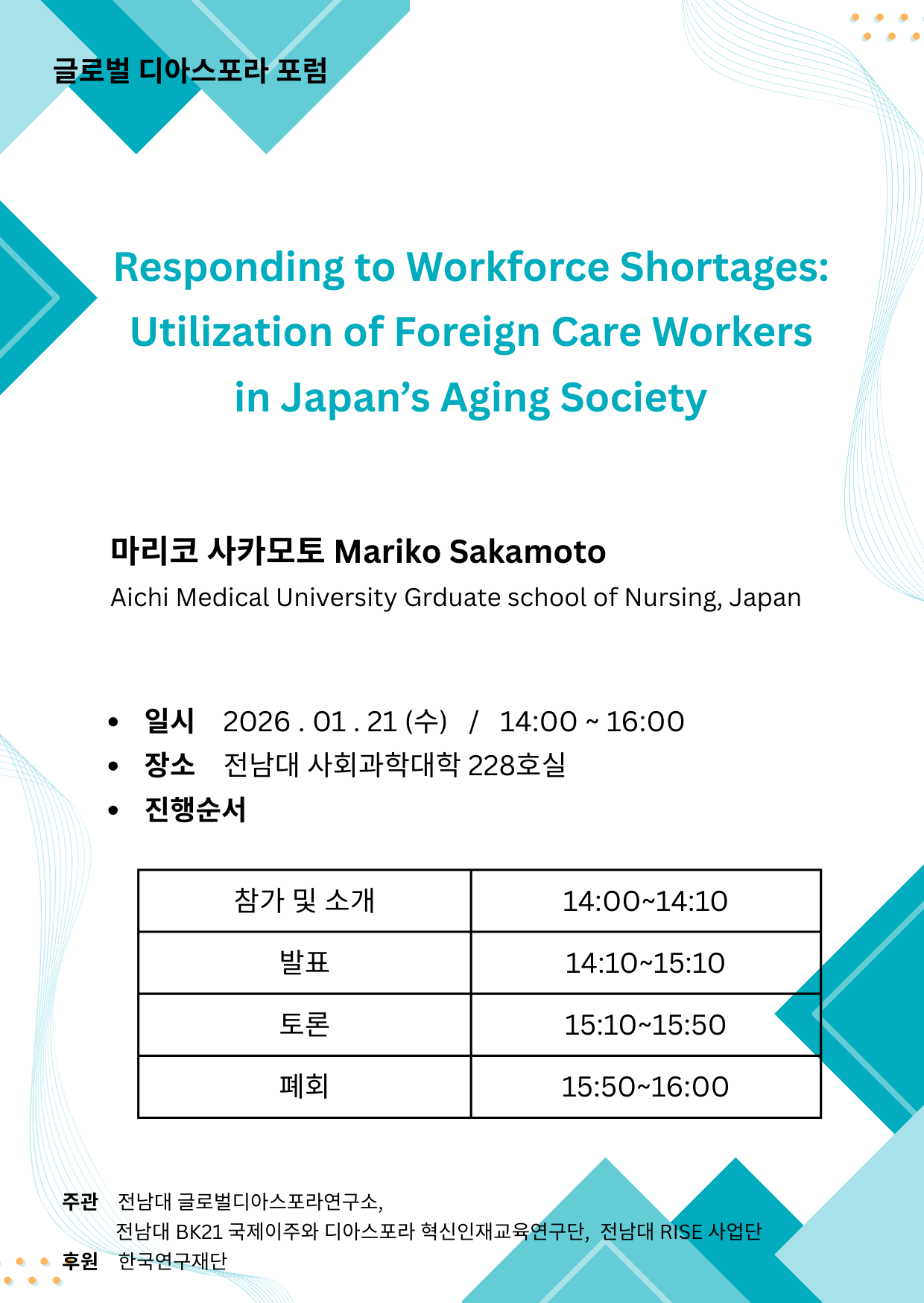 주관: 전남대 글로벌디아스포라연구소, 전남대 BK21 국제이주와 디아스포라 혁신인재교육연구단, 전남대 RISE 사업단
