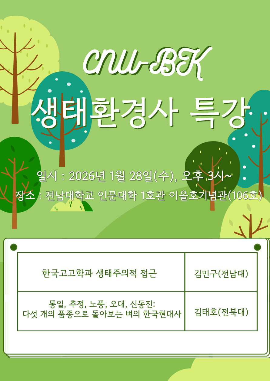 [전남대학교 사학과] CNU -BK 생태환경사 특강 2026.1.28.(수) 3:00PM ~ 6:00PM 전남대학교 인문대학 1호관 이을호기념관(106호) 참여대상: 전체(모든사람) 행사방식 : 오프라인(대면) 062-530-3240 공유하기