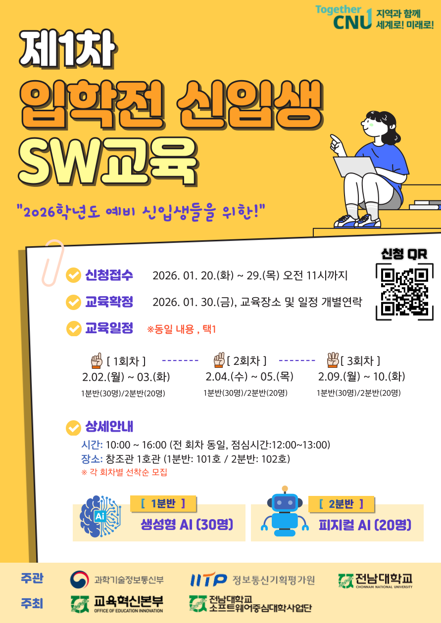🙌 전남대학교 교육혁신본부와 SW중심대학사업단에 함께하는 2026년 제1차 입학전 신입생 SW교육 🙌