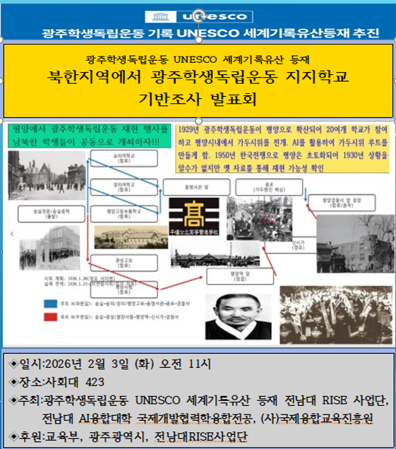 북한지역 광주학생독립운동 지지 학교 기반 조사 발표회 2026.2.2.(월) ~ 2026.2.5.(목)(4일간) 사회423 참여대상: 전체(모든사람) 행사방식 : 오프라인(대면) 공유하기