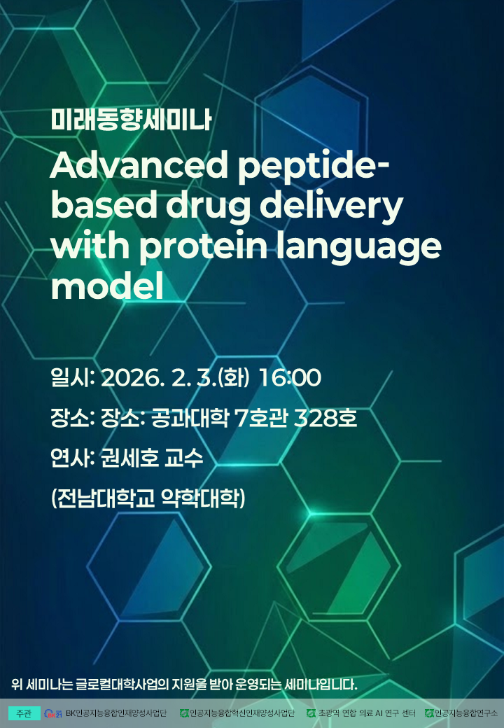 AI 미래동향(기술)세미나_Advanced peotide-based drug delivery with protein language model 2026.2.3.(화) 4:00PM ~ 6:00PM 공과대학 7호관 328호 참여대상: 전체(모든사람) 행사방식 : 오프라인(대면) 공유하기